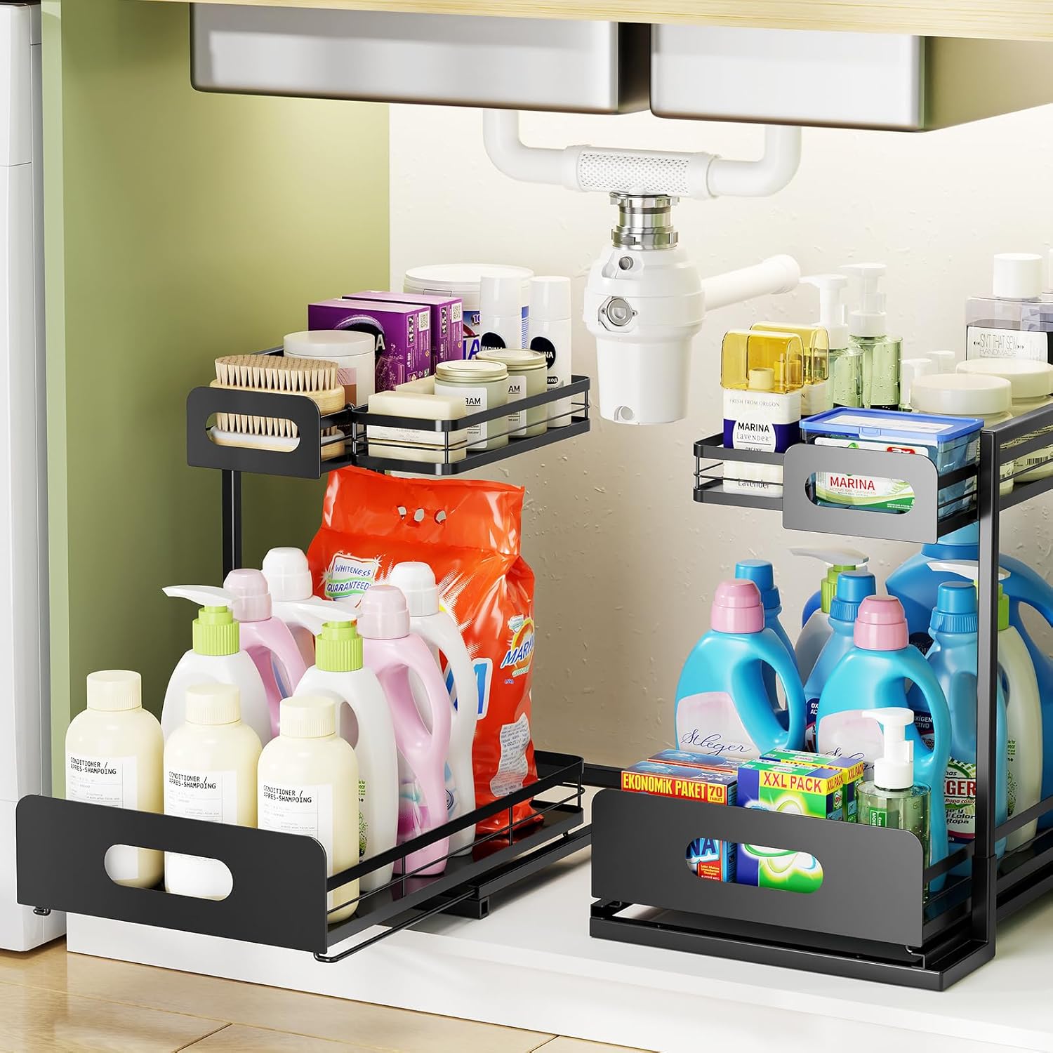 Delamu 2 Pack Metal Bathroom Organizers and Storage, 2 Tier Pull Out Under Sink Organizer with 2 Small Baskets, Adjustable Under Sink Shelf for Multipurpose Cabinet Organizer, Black