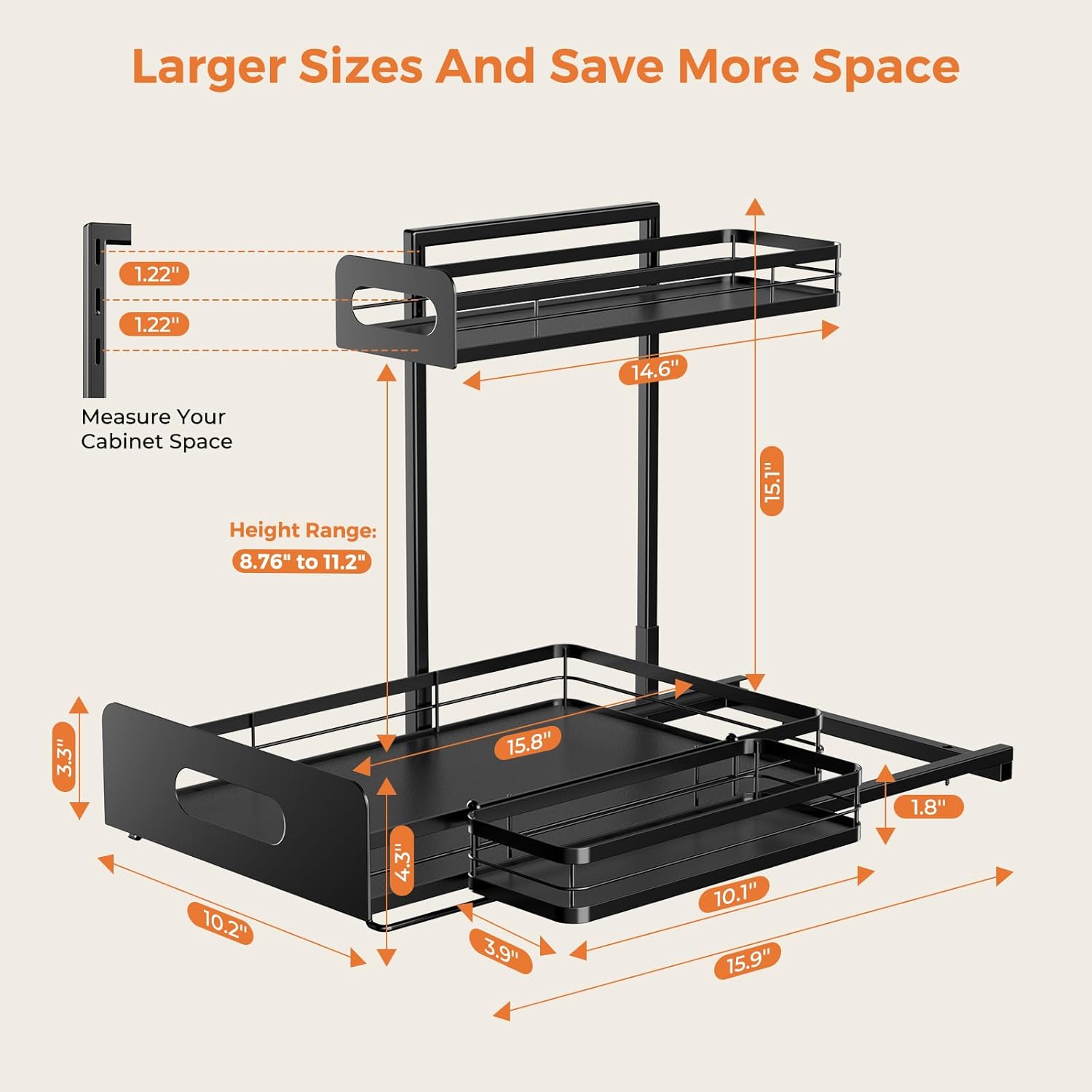 • Three-height adjustable design: 3 adjustable heights (12.8“-14”-15.2") easily fit 99% of cabinet & item sizes, and the shelves can be easily repositioned to accommodate extra-large spray bottles to optimize vertical space
