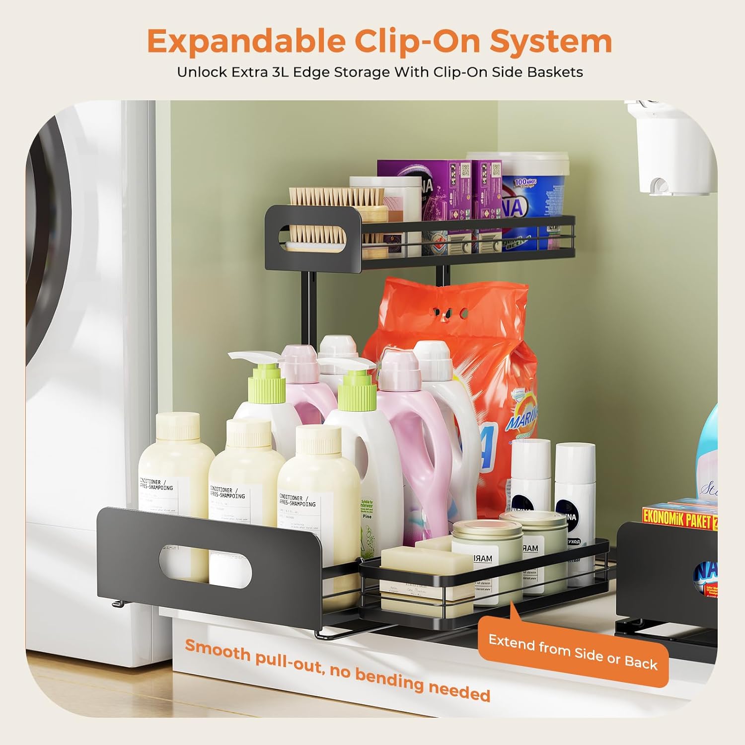 • ​​Hook-On Extra Storage Baskets: Delamu under sink organizers and storage includes a compact accessory basket that neatly stores sponges, brushes or other small items. This dedicated compartment reduces clutter and keeps frequently needed tools within reach while maximizing storage efficiency