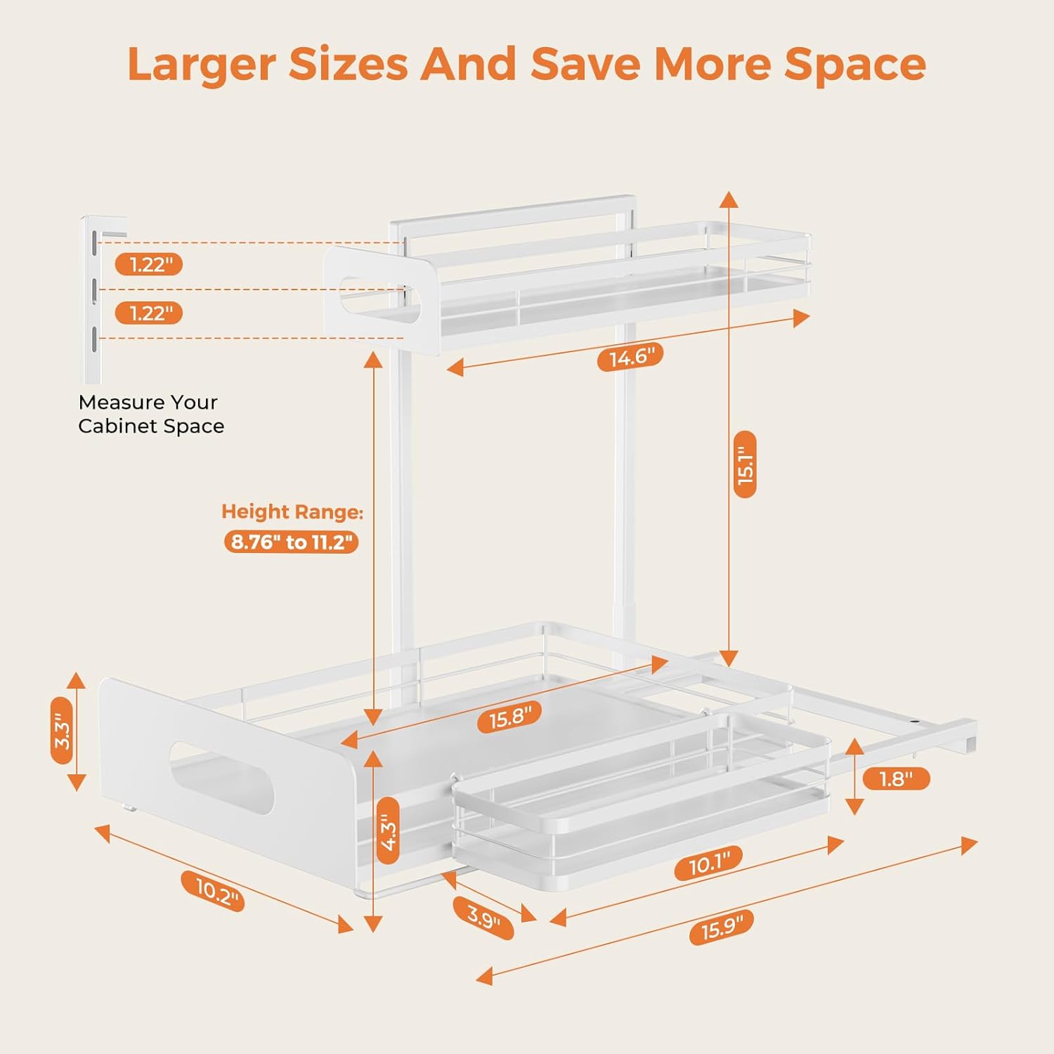 • Three-height adjustable design: 3 adjustable heights (12.8“-14”-15.2") easily fit 99% of cabinet & item sizes, and the shelves can be easily repositioned to accommodate extra-large spray bottles to optimize vertical space