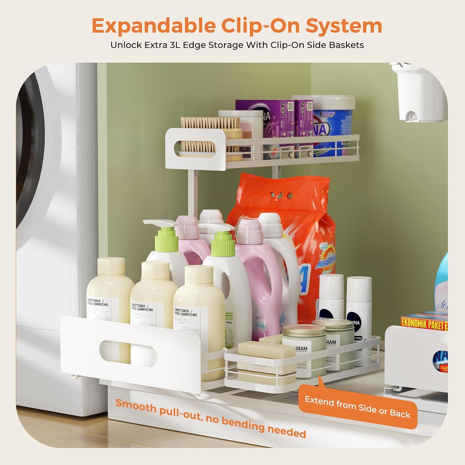 • ​​Hook-On Extra Storage Baskets: Delamu under sink organizers and storage includes a compact accessory basket that neatly stores sponges, brushes or other small items. This dedicated compartment reduces clutter and keeps frequently needed tools within reach while maximizing storage efficiency