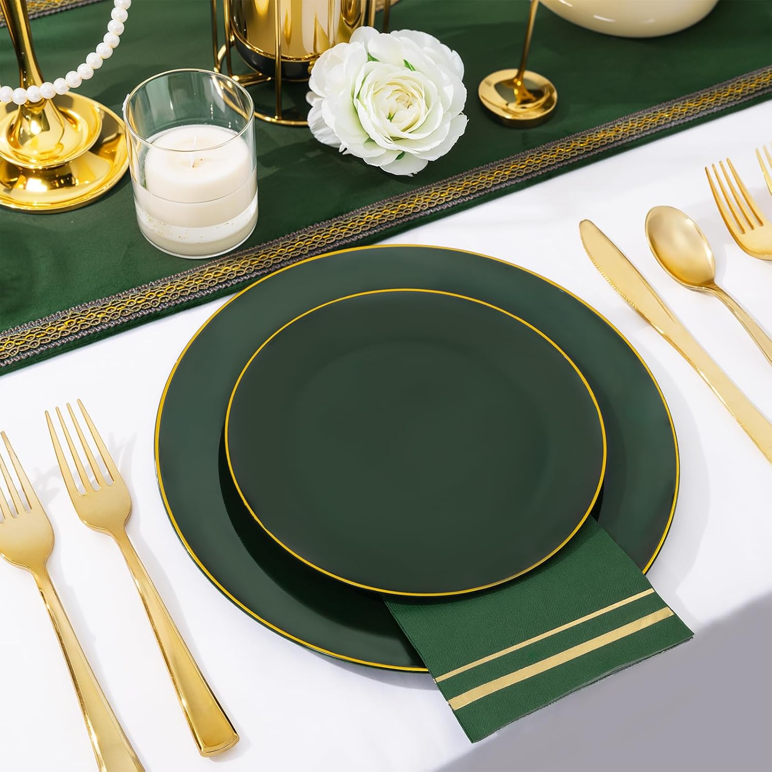 NOCCUR 350PCS Green Plastic Plates - Disposable Green Gold Dinnerware Set for 50 Guests, 100 Dinner/Dessert Plates, 150 Gold Silverware, 50 Cups&50 Napkins for Party/Wedding/Birthday/Christmas