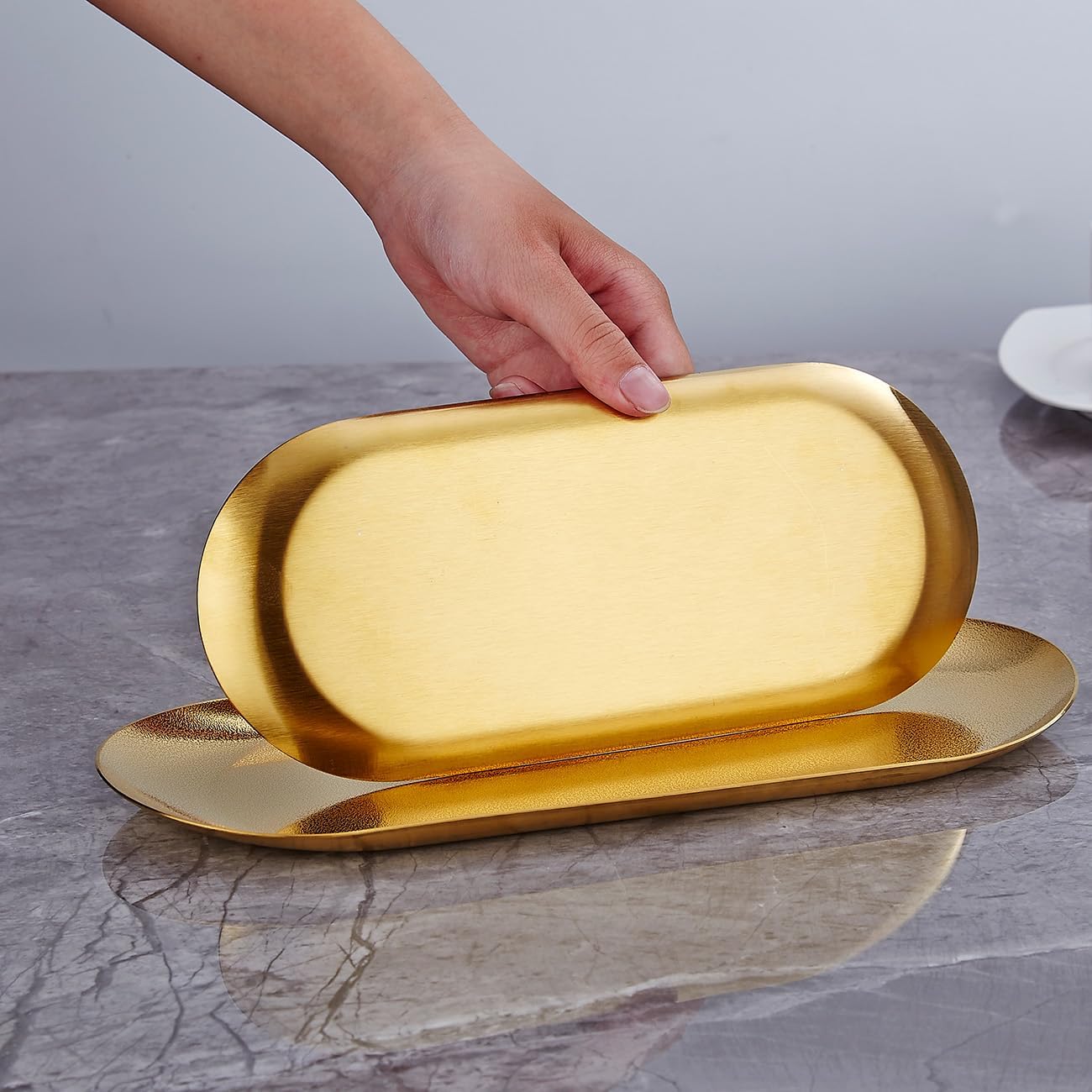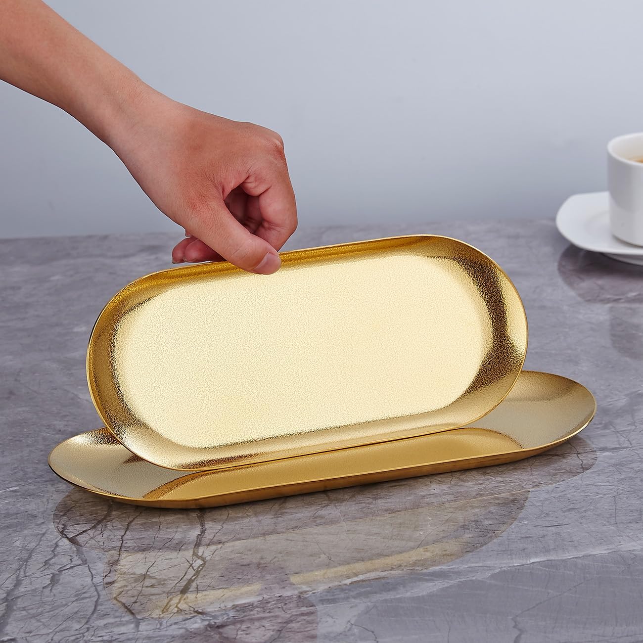 • ELEGANCE AND QUALITY:The ellipse shaped stainless steel plate is made of thickened stainless steel stamped with surface die-casting gold and silver patterns, bringing you an elegant and dazzling appearance. The thickened material plate has a heavy feeling, and as long as you like it, the plate will become your family heirloom tableware.