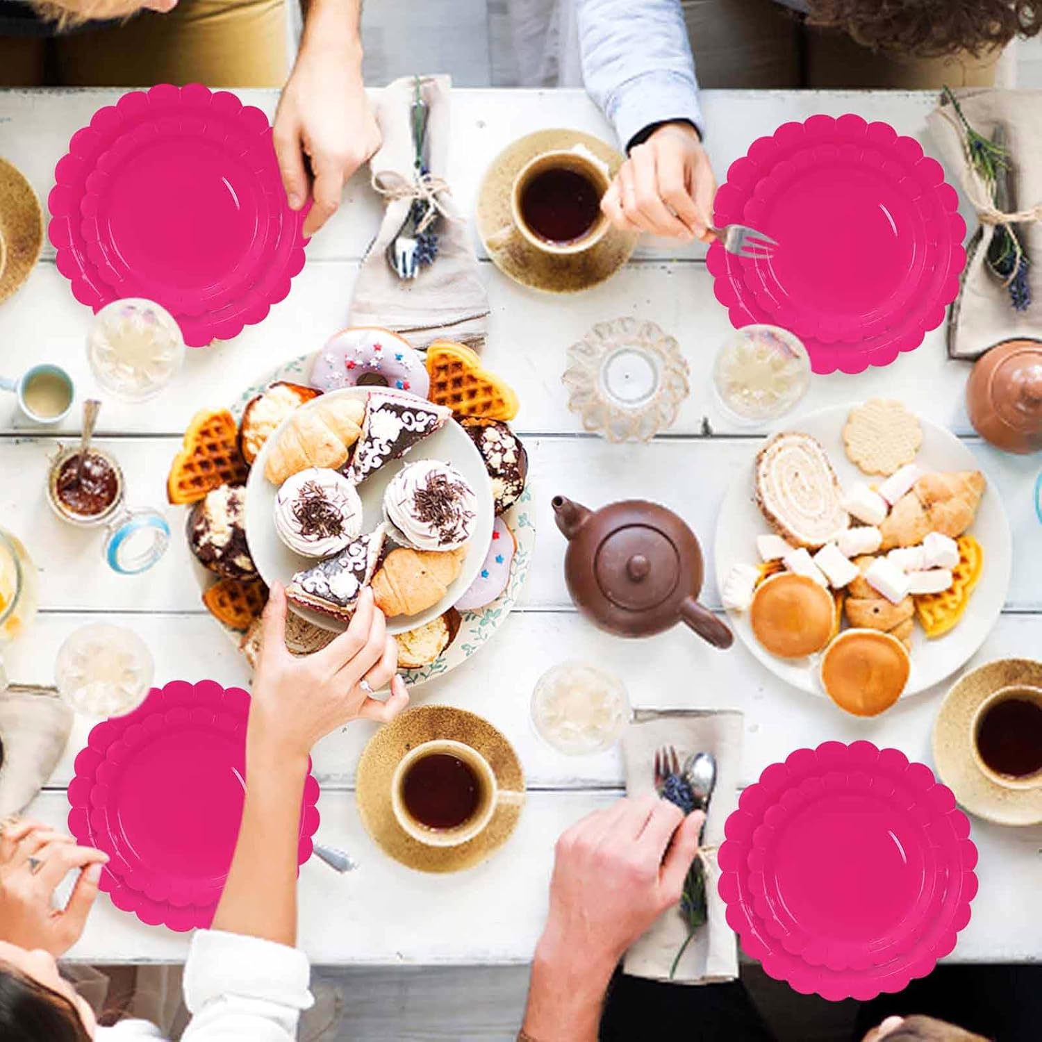 • Scalloped plates disposable: The hot pink paper plates with disposable design can reduce cleaning time, allowing you to enjoy more family time. The disposable hot pink dessert plates can provide convenience for both you and guests for parties