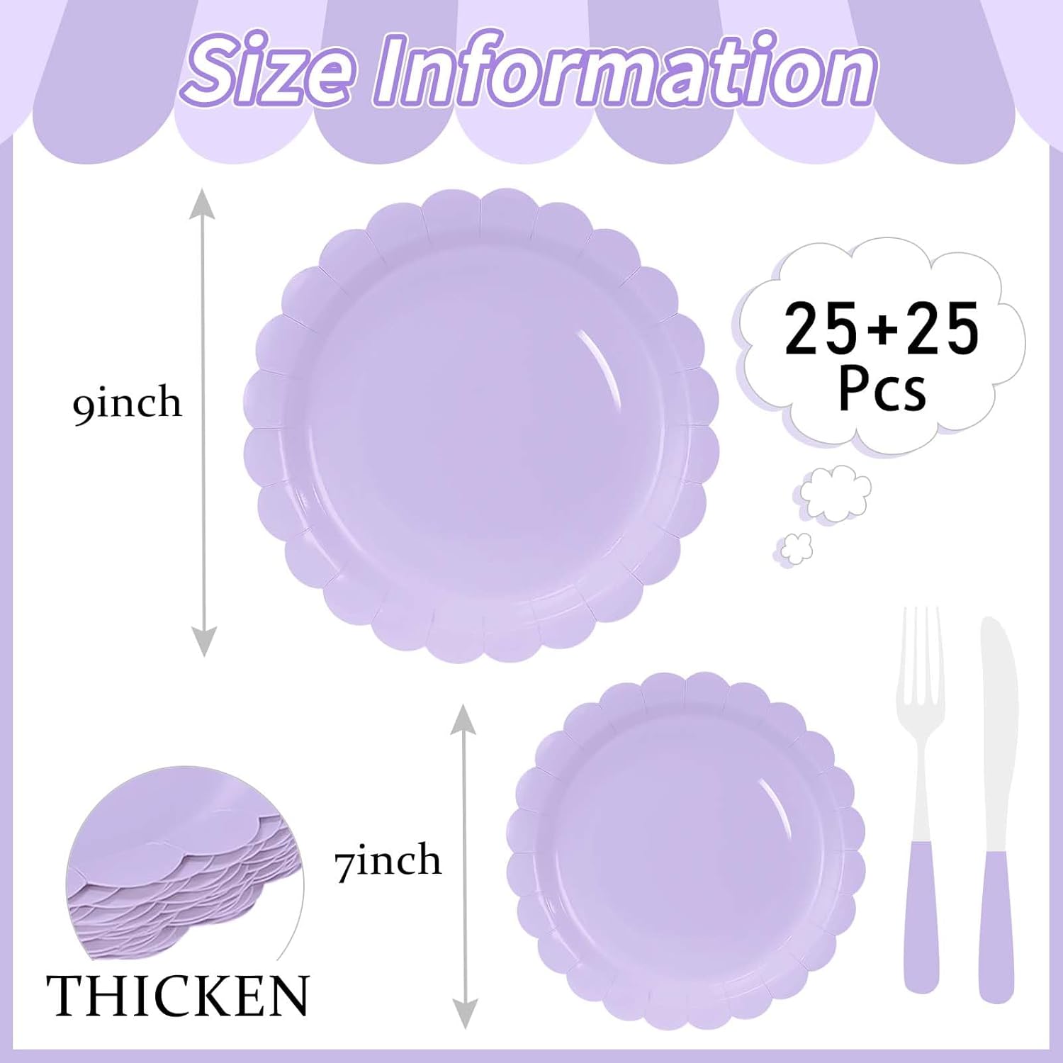 • Light purple plates: You will receive 25 pcs 7 inch and 25 pcs 9 inch light purple scalloped plates, which are sufficient for both daily dining needs or party needs. The purple scalloped dessert plates help to enhance the beauty and make the party more elegant