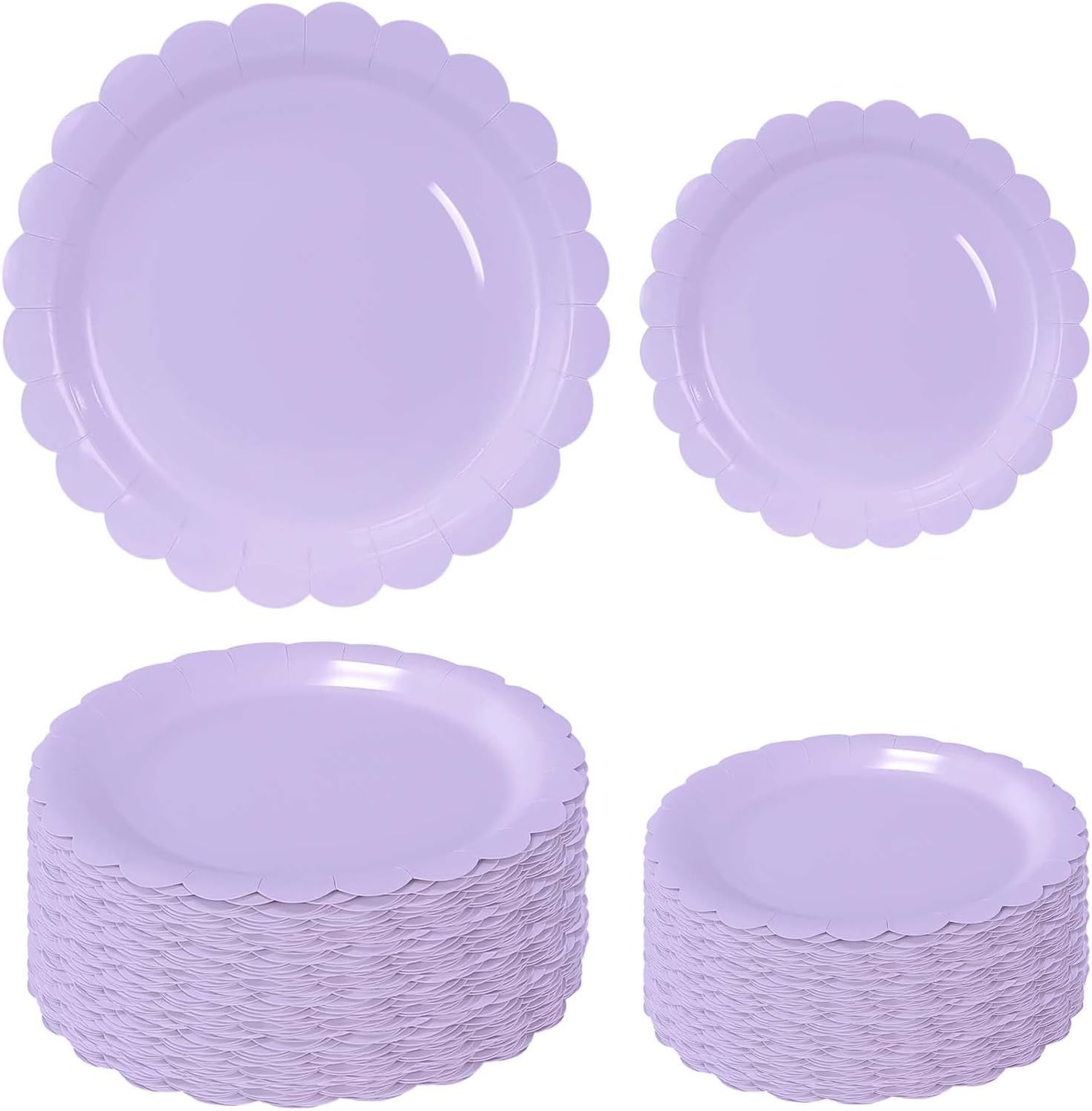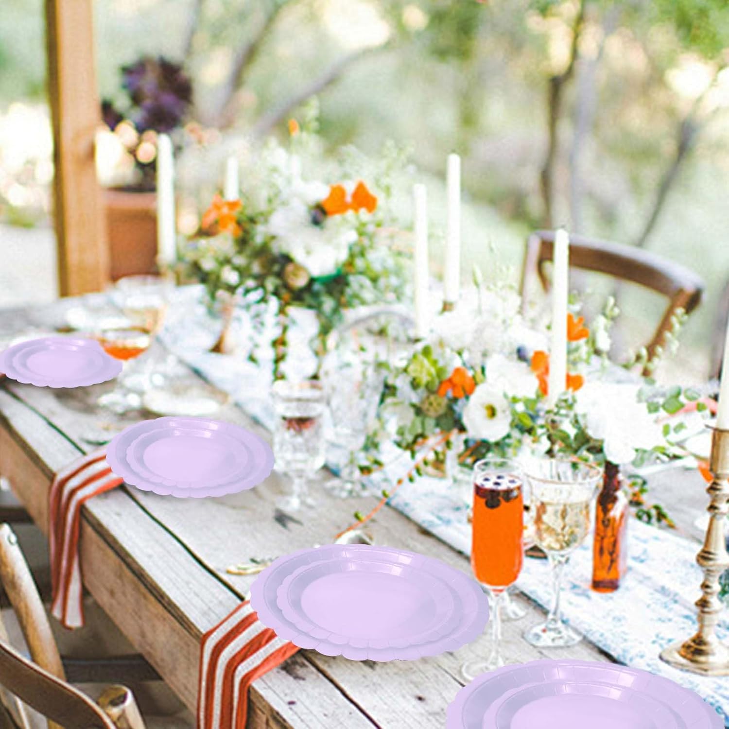 50 Pcs Light Purple Scalloped Paper Plates 25 × 7'' and 25 × 9'' Disposable Lavender Scalloped Dinner Plates for Wedding Baby Shower Birthday Party Disposable Dessert Plate