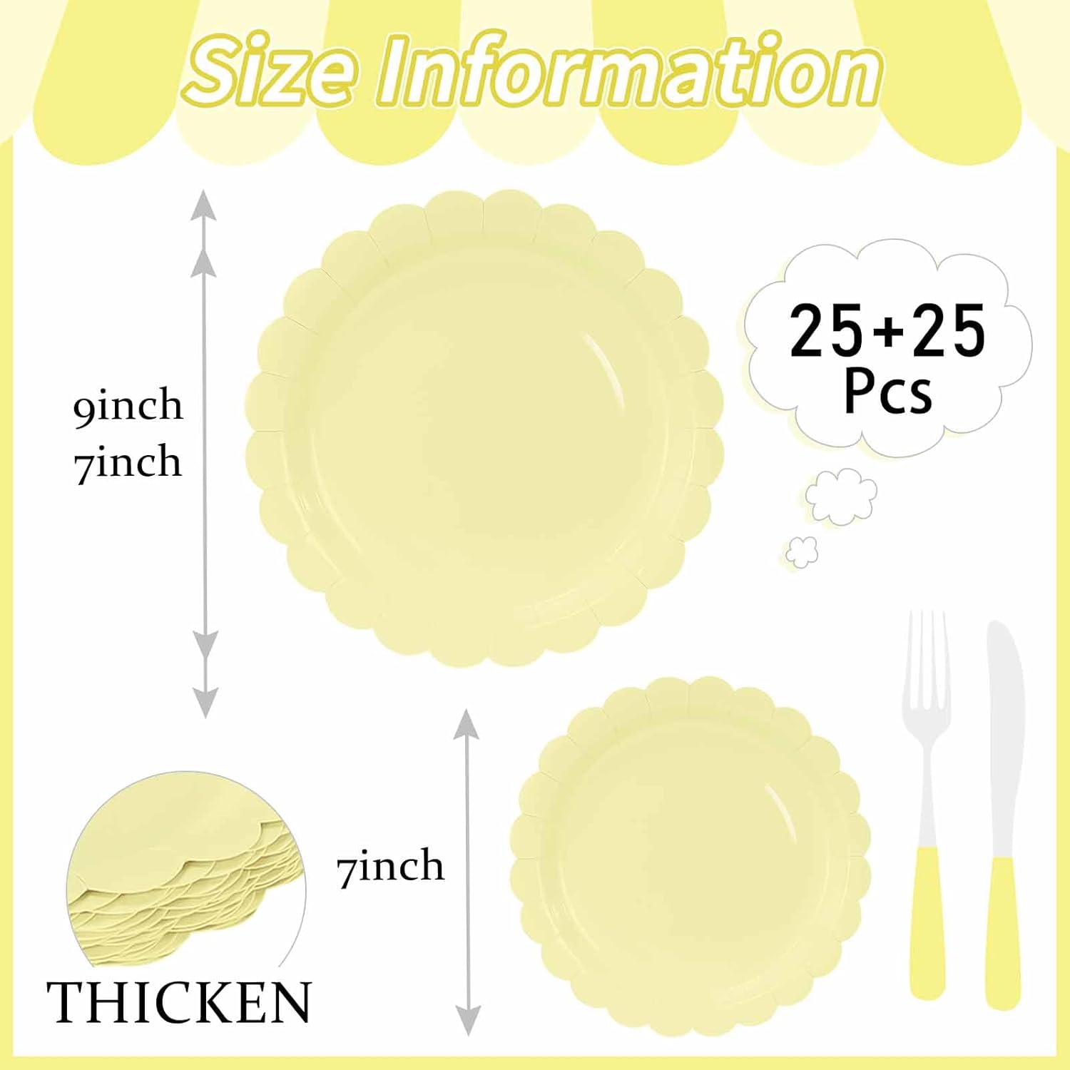 • Yellow plates: You will receive 25 pcs 7 inch and 25 pcs 9 inch yellow scalloped plates, which are sufficient for both daily dining needs or party needs. The yellow scalloped dessert plates help to enhance the beauty and make the party more elegant
