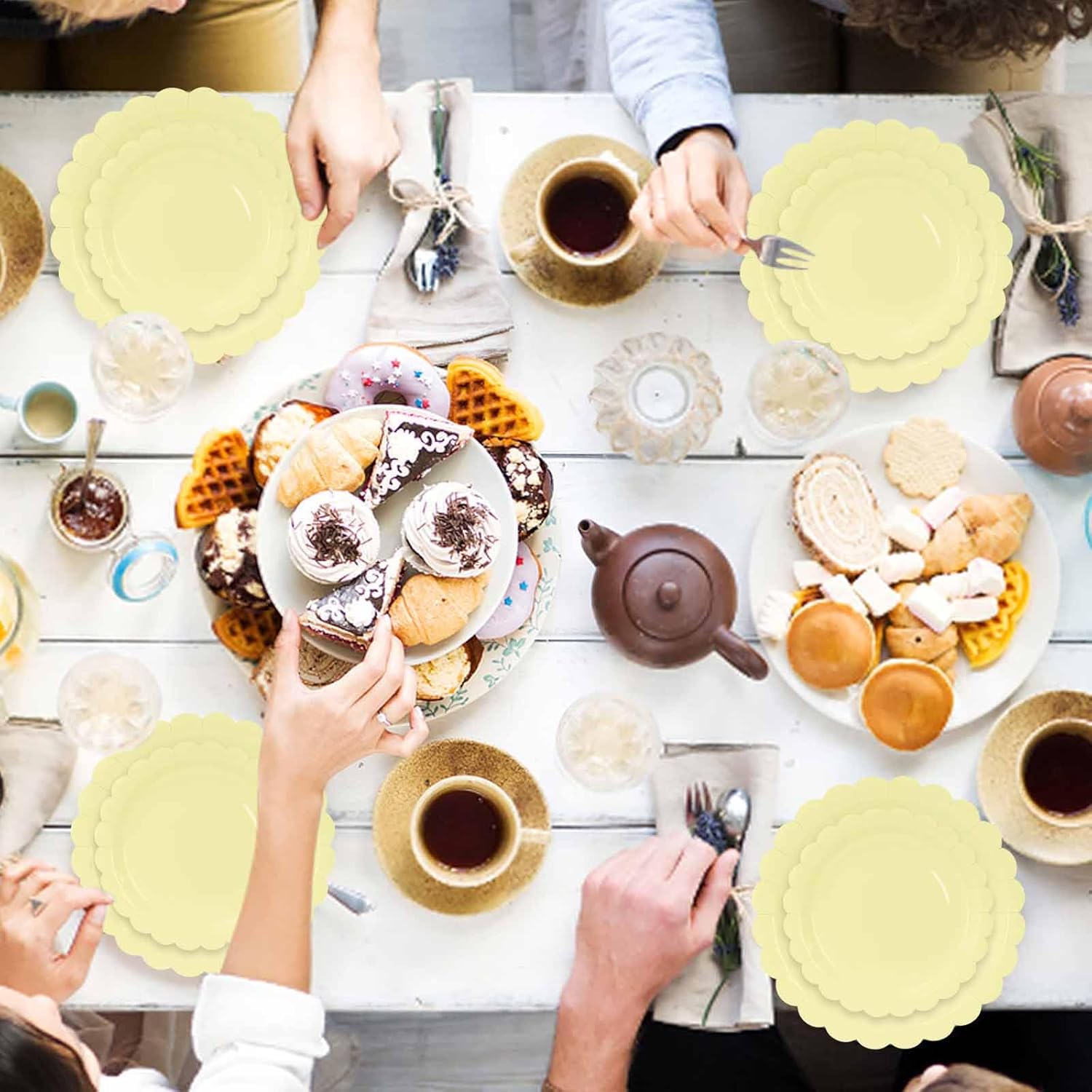 • Scalloped plates disposable: The yellow scalloped paper plates with disposable design can reduce cleaning time, allowing you to enjoy more family time. The disposable yellow dessert plates can provide convenience for both you and guests for parties