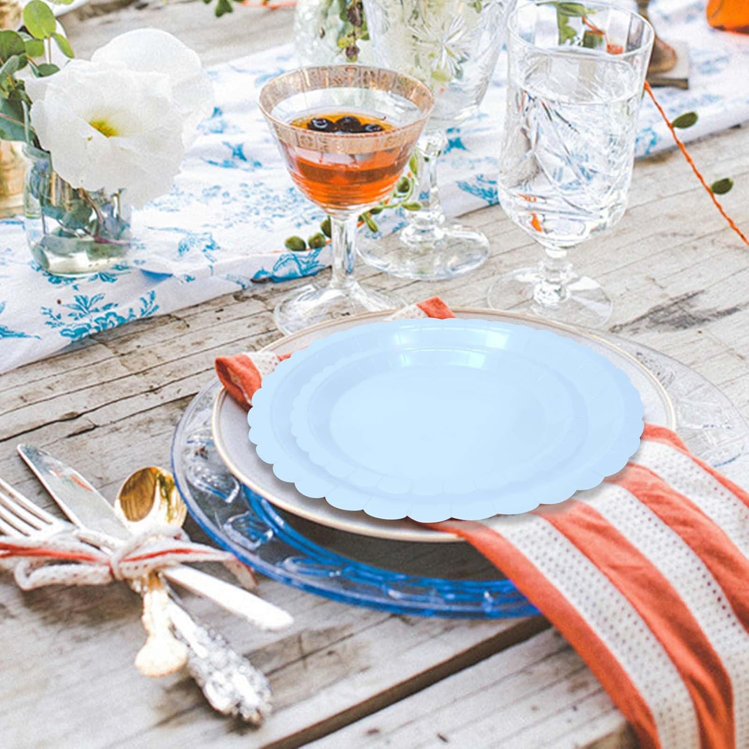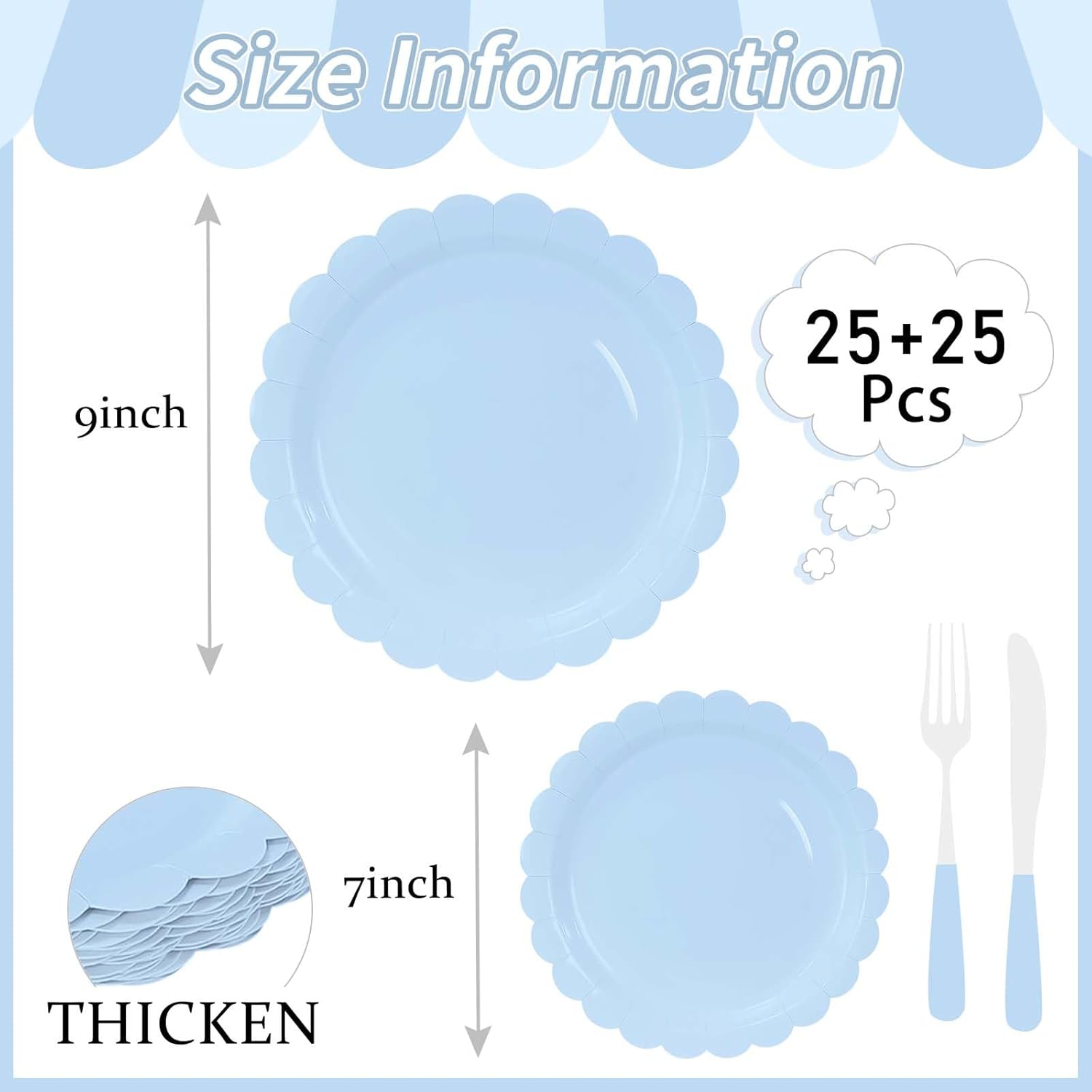 50 Pcs Light Blue Scalloped Paper Plates 25 × 7'' and 25 × 9'' Disposable Baby Blue Scalloped Dinner Plates for Wedding Baby Shower Birthday Party Disposable Dessert Plate