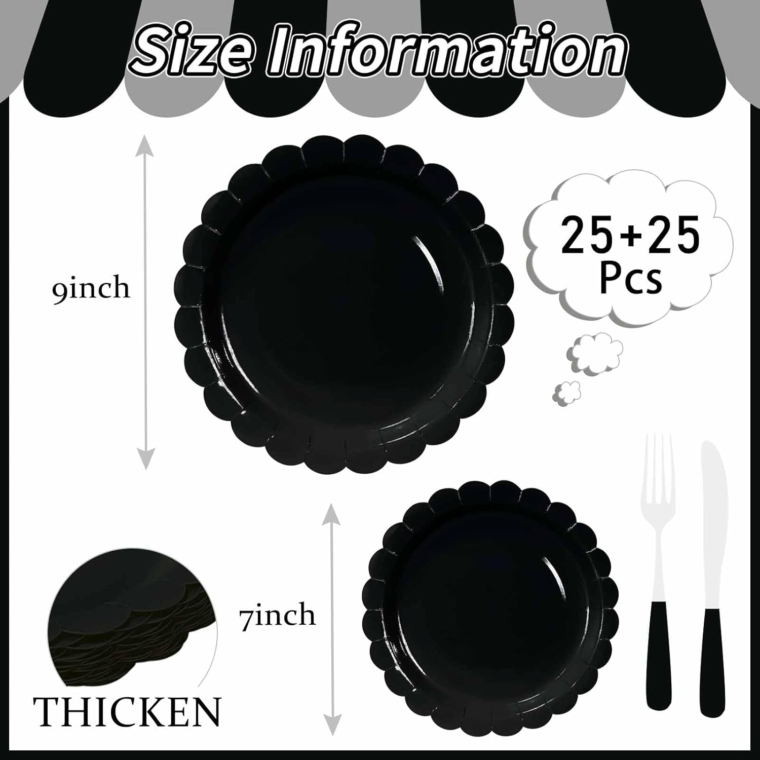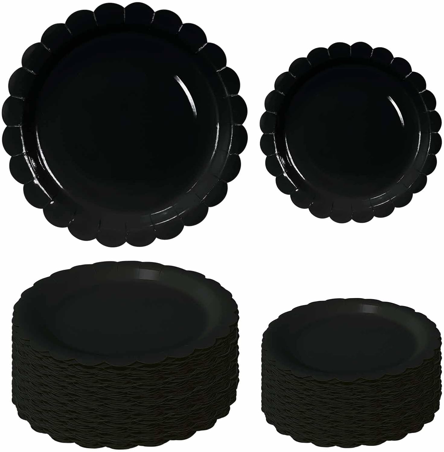 • Black plates: You will receive 25 pcs 7 inch and 25 pcs 9 inch black scalloped plates, which are sufficient for both daily dining needs or party needs. The black scalloped dessert plates help to enhance the beauty and make the party more elegant
