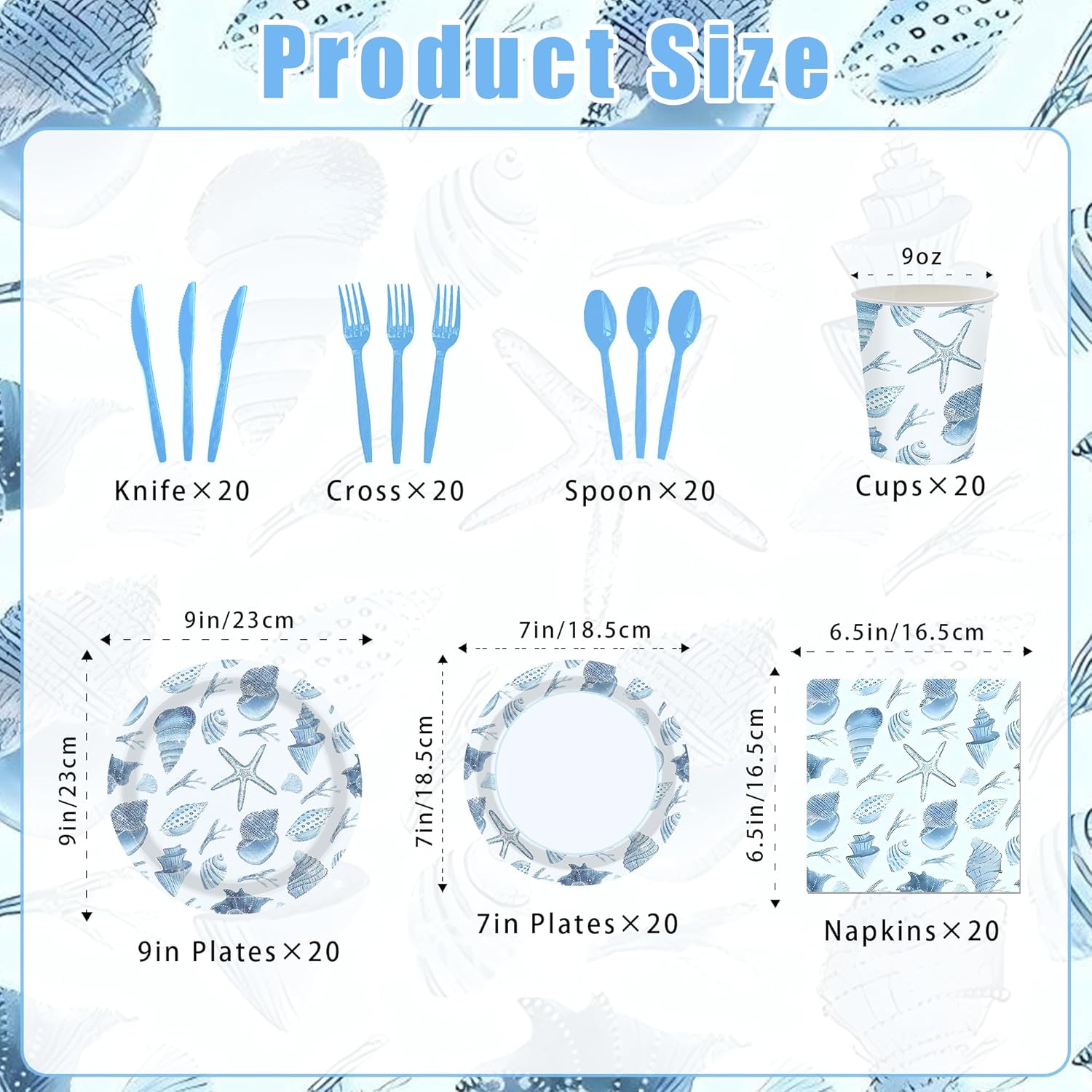 • Seashell Beach Party Decorations Serves 20 : Our seashell beach party decorations included 20 pcs 9'' paper dinner plates, 20 pcs 7'' paper dessert plates, 20 pcs 9 oz cups, 20 pcs paper napkins 6.5'' * 6.5'' folded, 20 pcs forks, 20 pcs spoons, 20 pcs knives . Our Summer birthday party decorations can meet all your party needs.