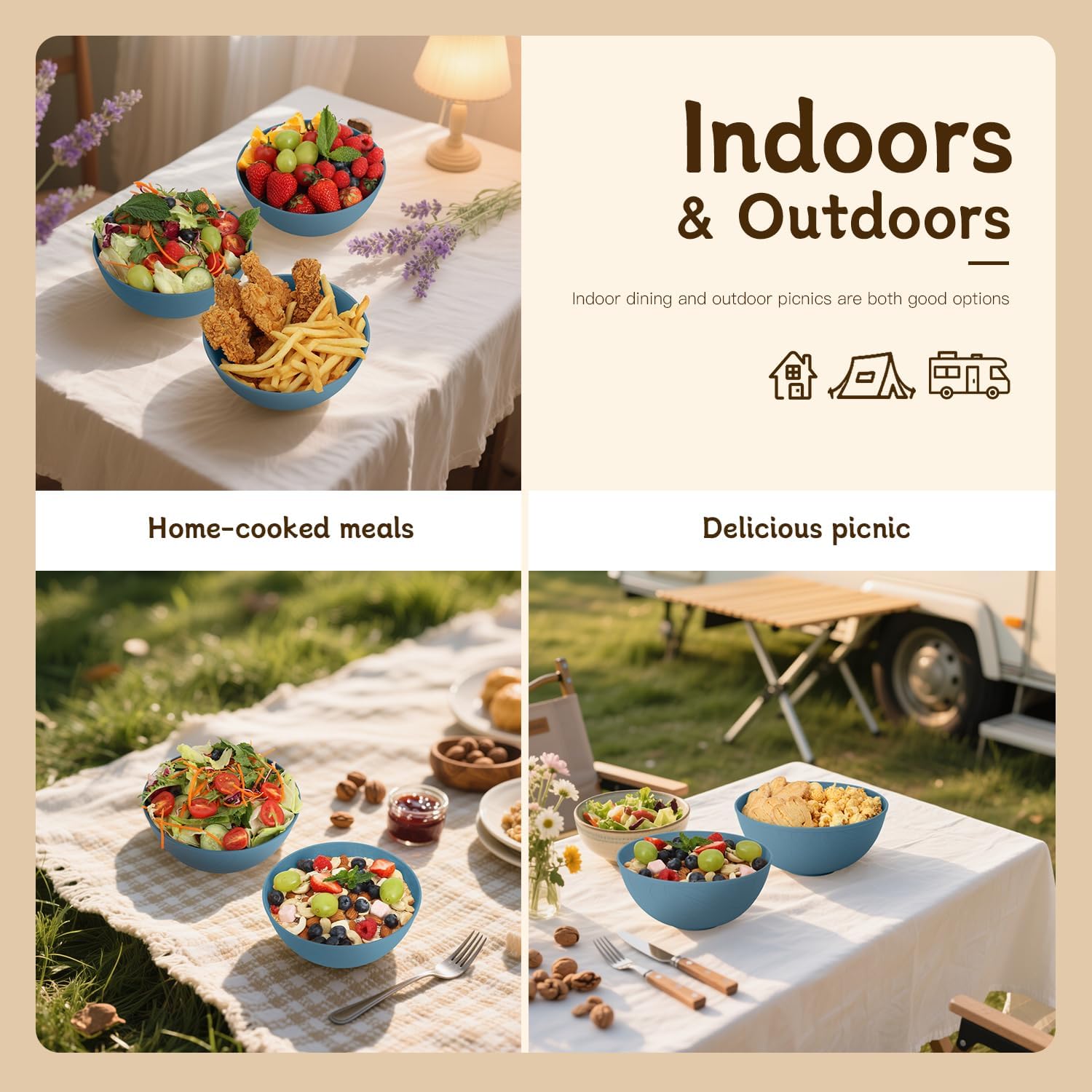 • 【𝗜𝗻𝗱𝗼𝗼𝗿𝘀 & 𝗢𝘂𝘁𝗱𝗼𝗼𝗿𝘀 𝗨𝘀𝗶𝗻𝗴】- These bowls are lightweight and unbreakable, featuring a smooth surface that makes cleaning effortless. Perfect for camping, RV trips, and outdoor adventures. Their unique flowing water pattern elevates them beyond traditional tableware, transforming everyday meals into aesthetic experiences at home.