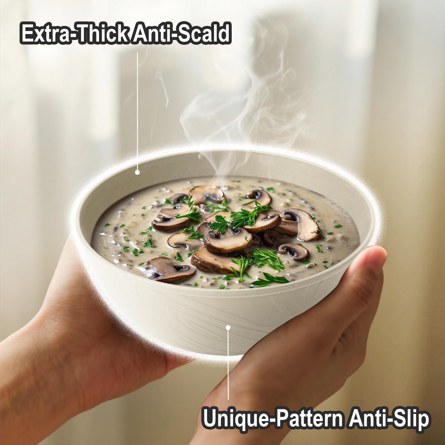 • 【𝗣𝗿𝗲𝗺𝗶𝘂𝗺 𝗤𝘂𝗮𝗹𝗶𝘁𝘆 𝗘𝘅𝘁𝗿𝗮 𝗧𝗵𝗶𝗰𝗸 𝗕𝗼𝘄𝗹𝘀】- Our wheat straw bowls are unbreakable for daily used. These kitchen bowls are designed thicker than general bowls in order to anti-scald.The flowing pattern around bowls are designed for anti-slipping.Wrova is committed to improving the safety and user experience of tableware.
