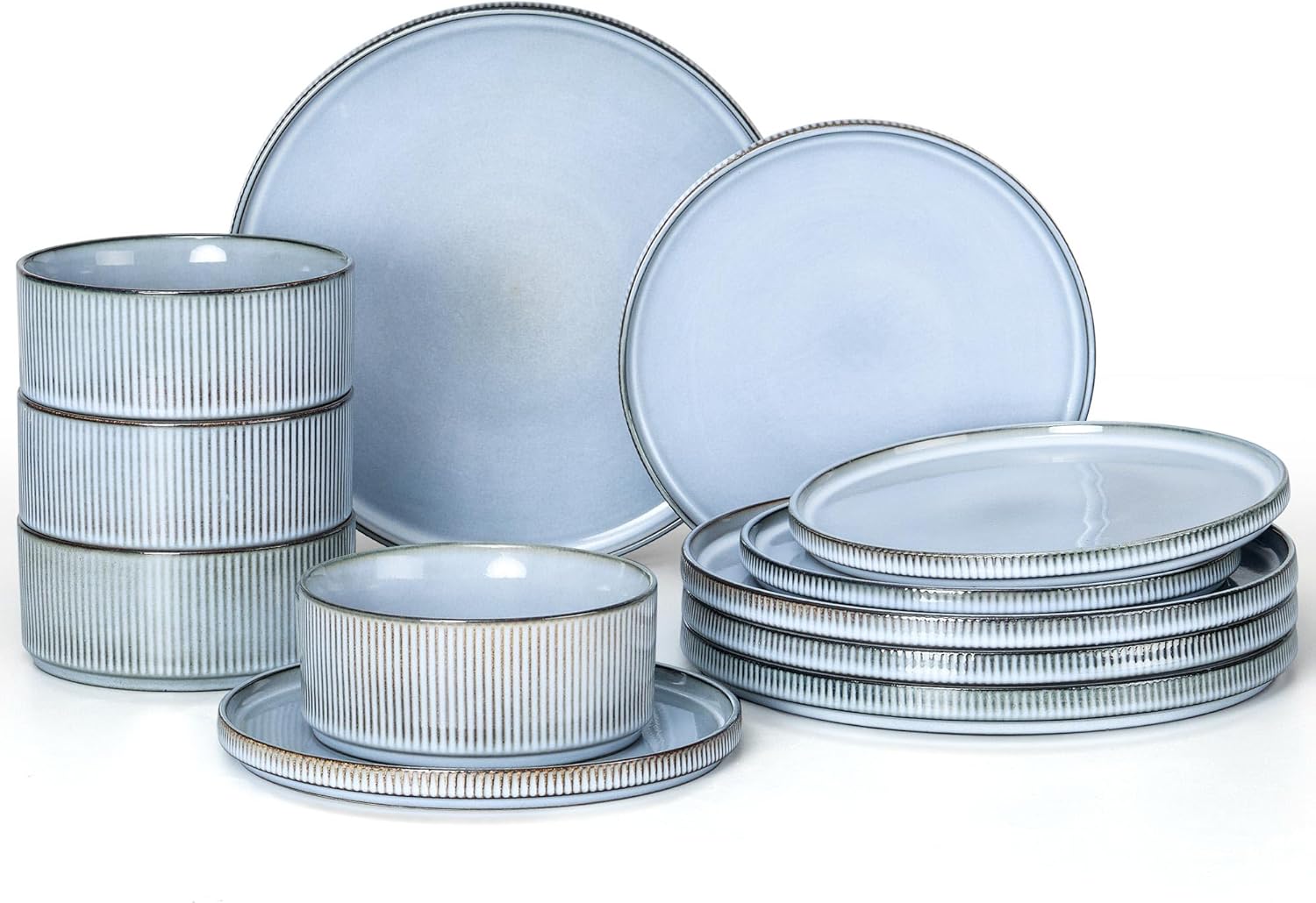E-far 12-Piece Plates and Bowls Sets, Stoneware Dinnerware Dishes Sets for 4, Kitchen Modern Dining Dishware, Chip & Scratch Resistant, Microwave & Dishwasher Safe, Dusty Blue