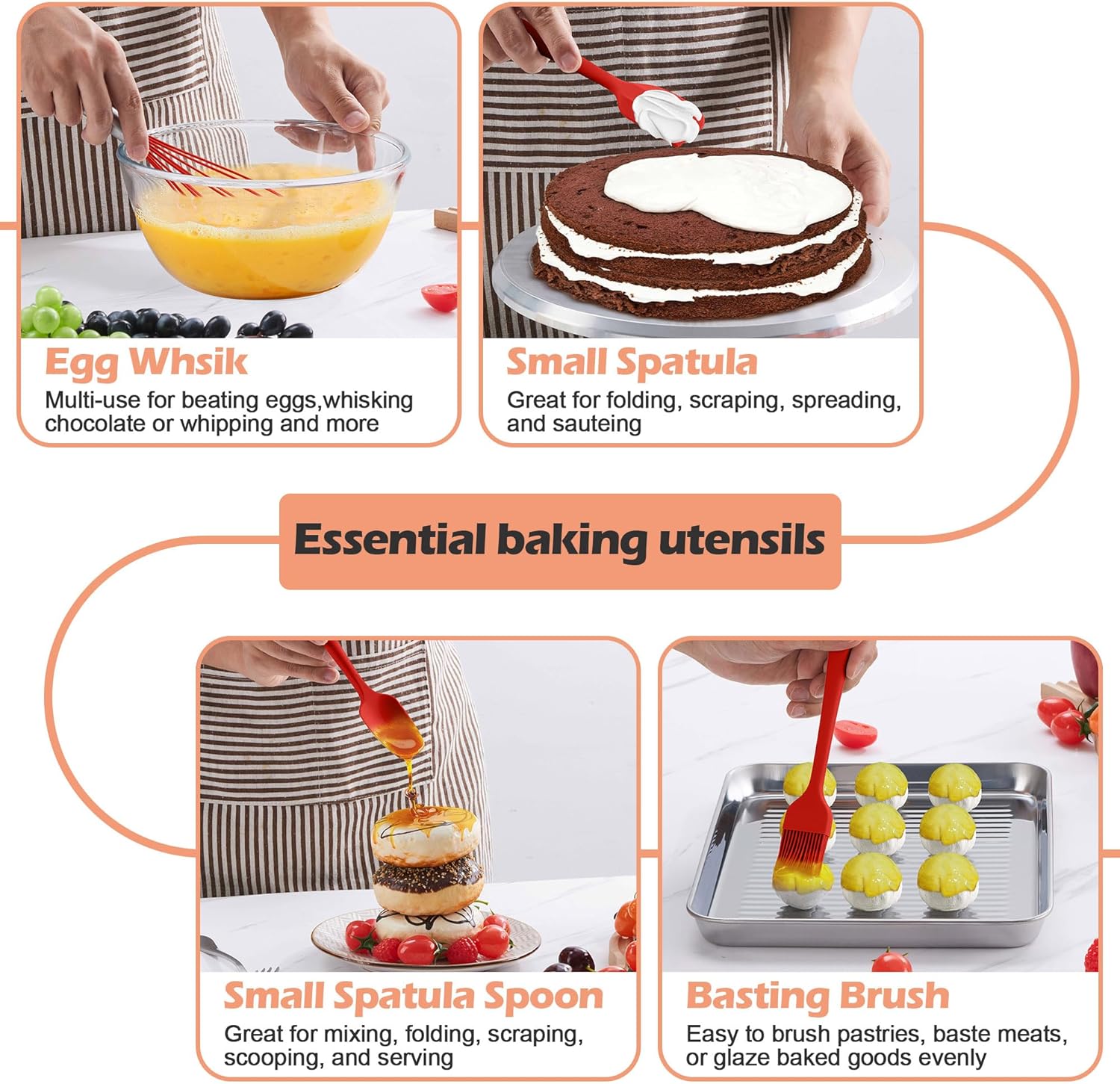 • Heat resistant silicone, our cooking utensils set is made of food grade silicone without any harmful substance, premium silicone withstand high temperature up to 446ºF, no need worry about melting or deforming, nontoxic and healthy for daily cooking, frying, stirring, baking, mixing and serving