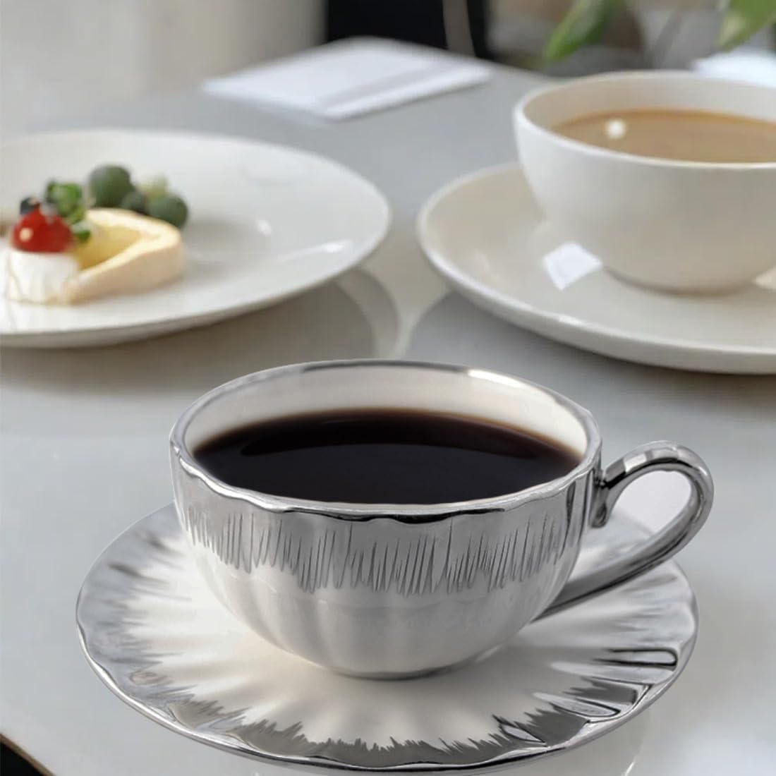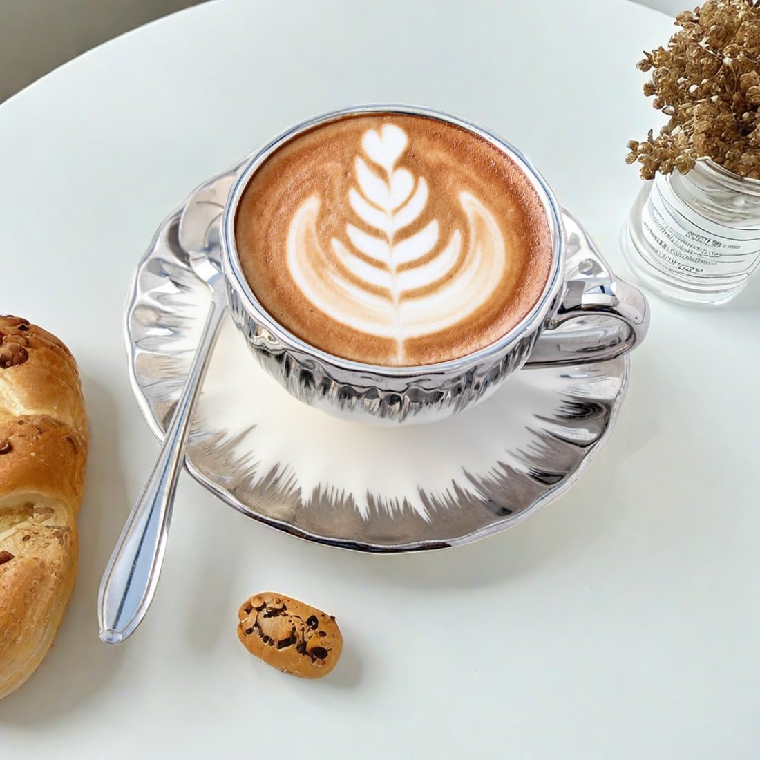 6 Teacups Tea Tray Spoon Set, 6oz with Galvanized Gold Rim and Gift Box, Ceramic White English Coffee Teacup (silver, Large)