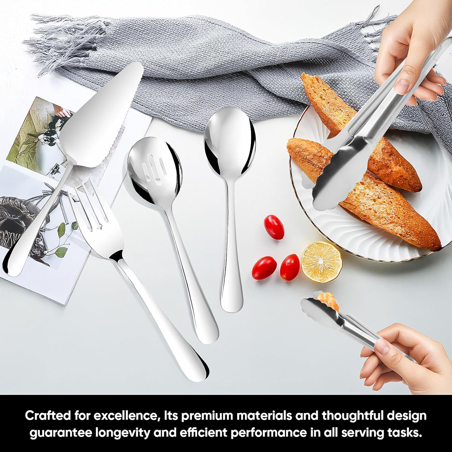 14PCS Serving Utensils - Hostess Serving Utensils Set, Premium Stainless Steel 8.7 inch Serving Utensils, Slotted Spoons, Fork, Tongs, Cake Pie Server for Buffet, Wedding, Dinner (Silver)