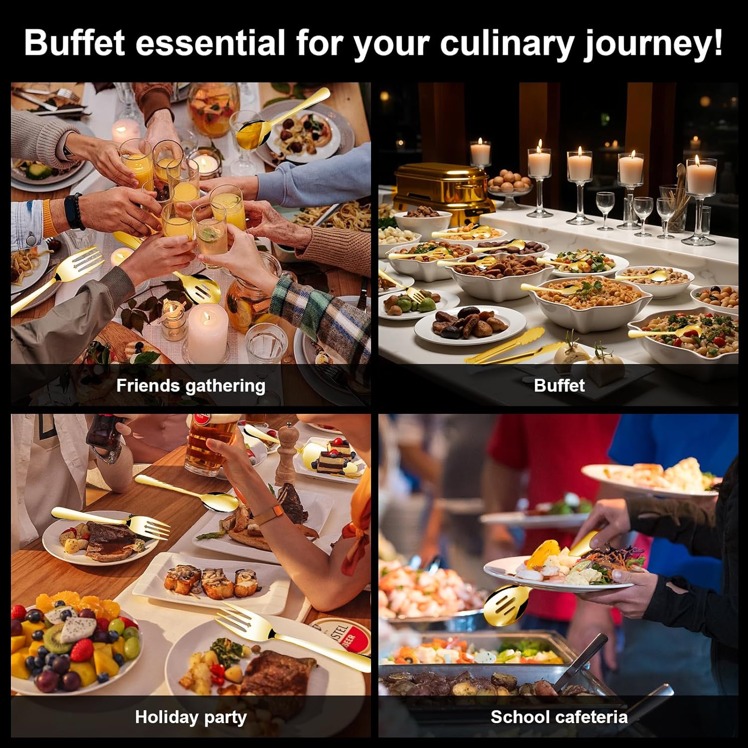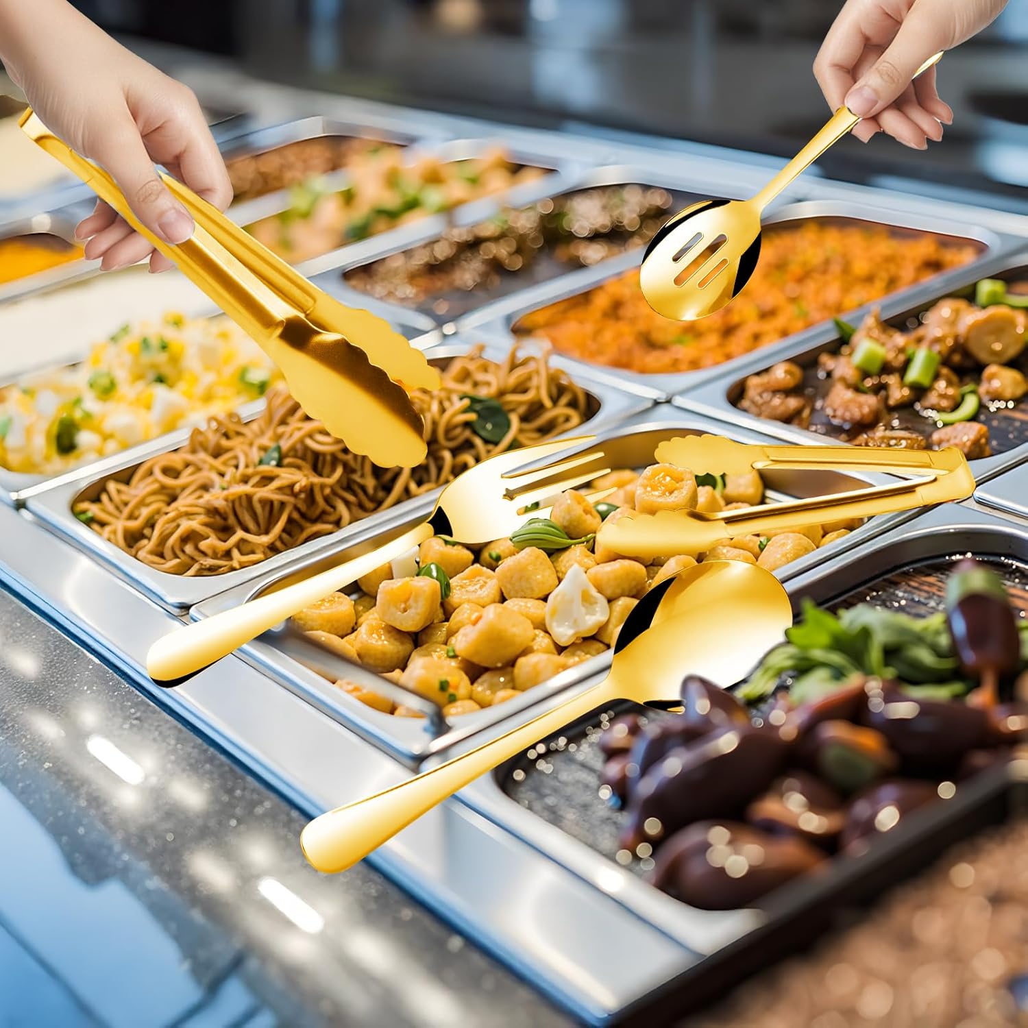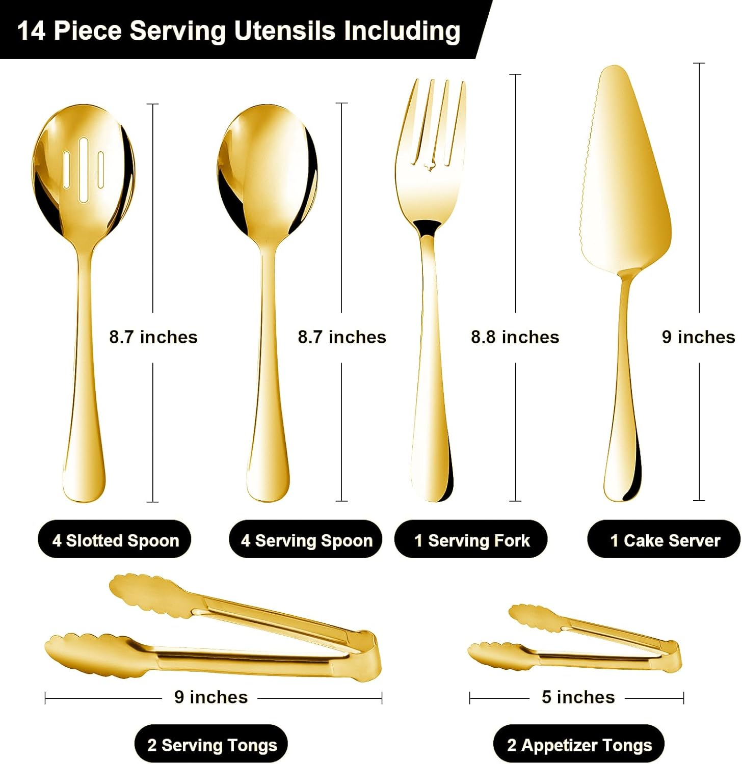 14PCS Serving Utensils - Hostess Serving Utensils Set, Premium Stainless Steel 8.7 inch Serving Utensils, Slotted Spoons, Fork, Tongs, Cake Pie Server for Buffet, Wedding, Dinner (Gold)