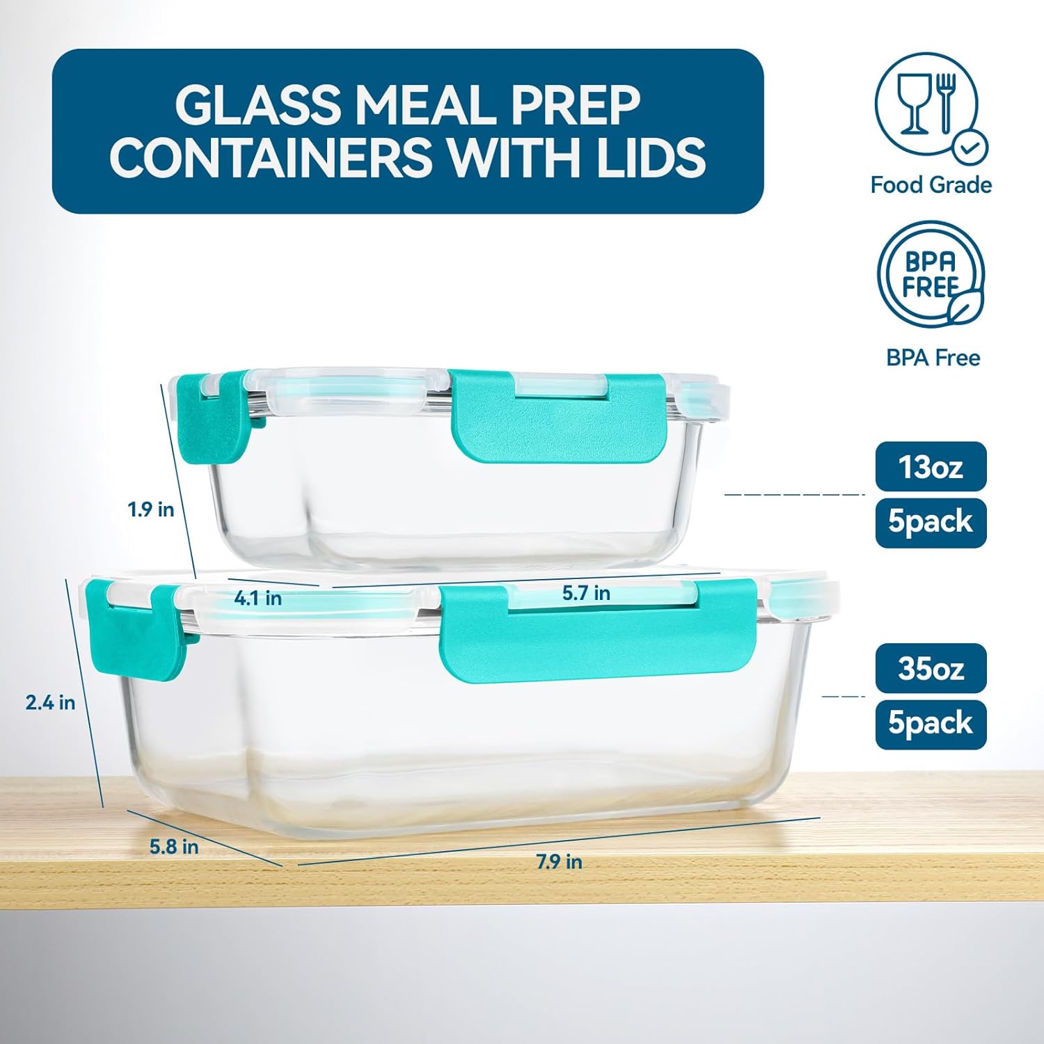 • Versatile Food Storage Containers: Includes 5 pieces of 35oz and 5 pieces of 13oz glass storage containers with lids, perfect for meal prepping, portion control, work lunches, gym meals, picnics, and travel. Great for storing leftovers, salads, soups, sauces and snacks.