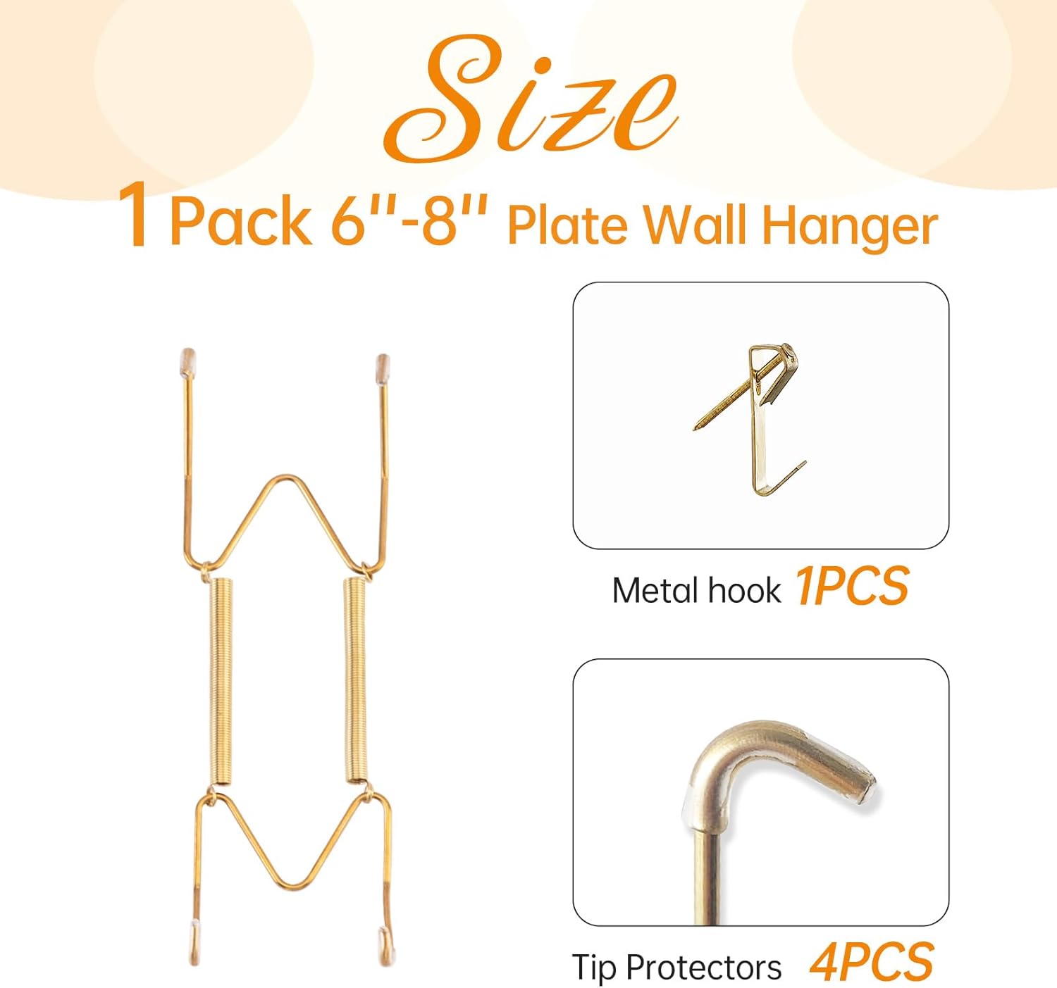 • Fits 6–8 Inch Plates with Spring Flexibility – The spring-loaded design ensures a snug fit for plates ranging from 6'' to 8''. Whether round, square, ceramic, or porcelain, this hanger provides flexible tension that keeps your plate stable while adjusting perfectly to its size.