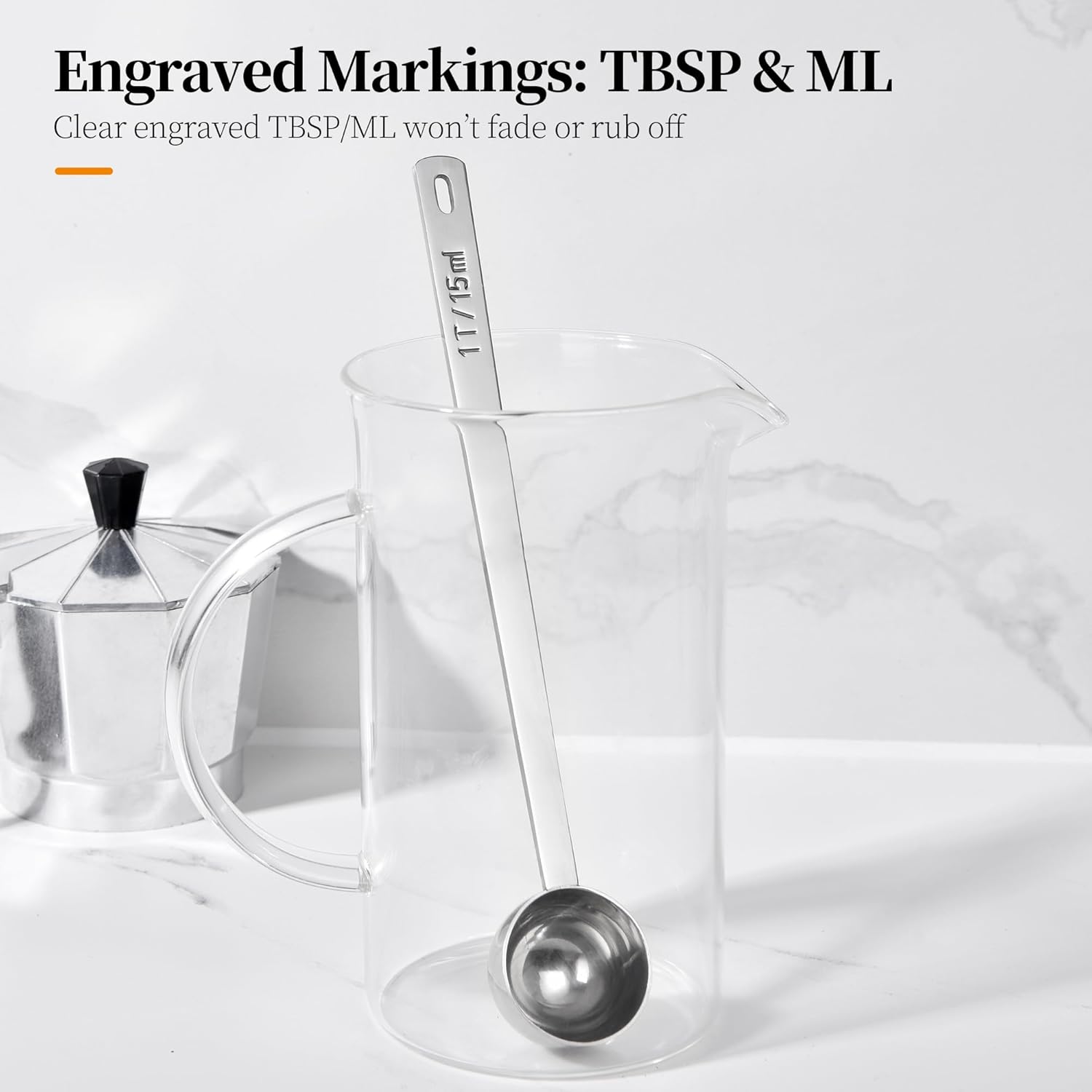• [Always Accurate – Clear, Fade-Proof Marks] This 1 tablespoon scoop is designed for accurate measuring every time. It holds exactly 1 tablespoon (15ml) - so your coffee always tastes just right. The deep engraved-etched measurement lines on the coffee spoon won't fade or rub off like cheap printed marks, staying clearly visible even after years of daily use. The precisely measured bowl ensures you never accidentally use too much or too little. No fading. No mistakes.