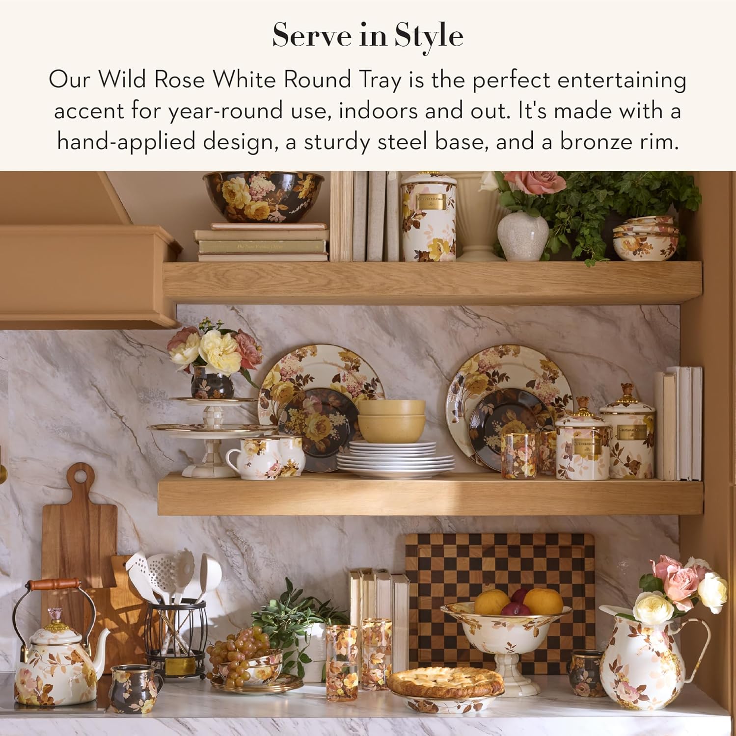 • ELEGANT SERVING ESSENTIAL: Serve food and drinks in style with the exquisite Wild Rose White round decorative tray. This circular tray features a hand-applied rustic rose floral design and a bronzed stainless-steel rim on a sturdy steel underbody.