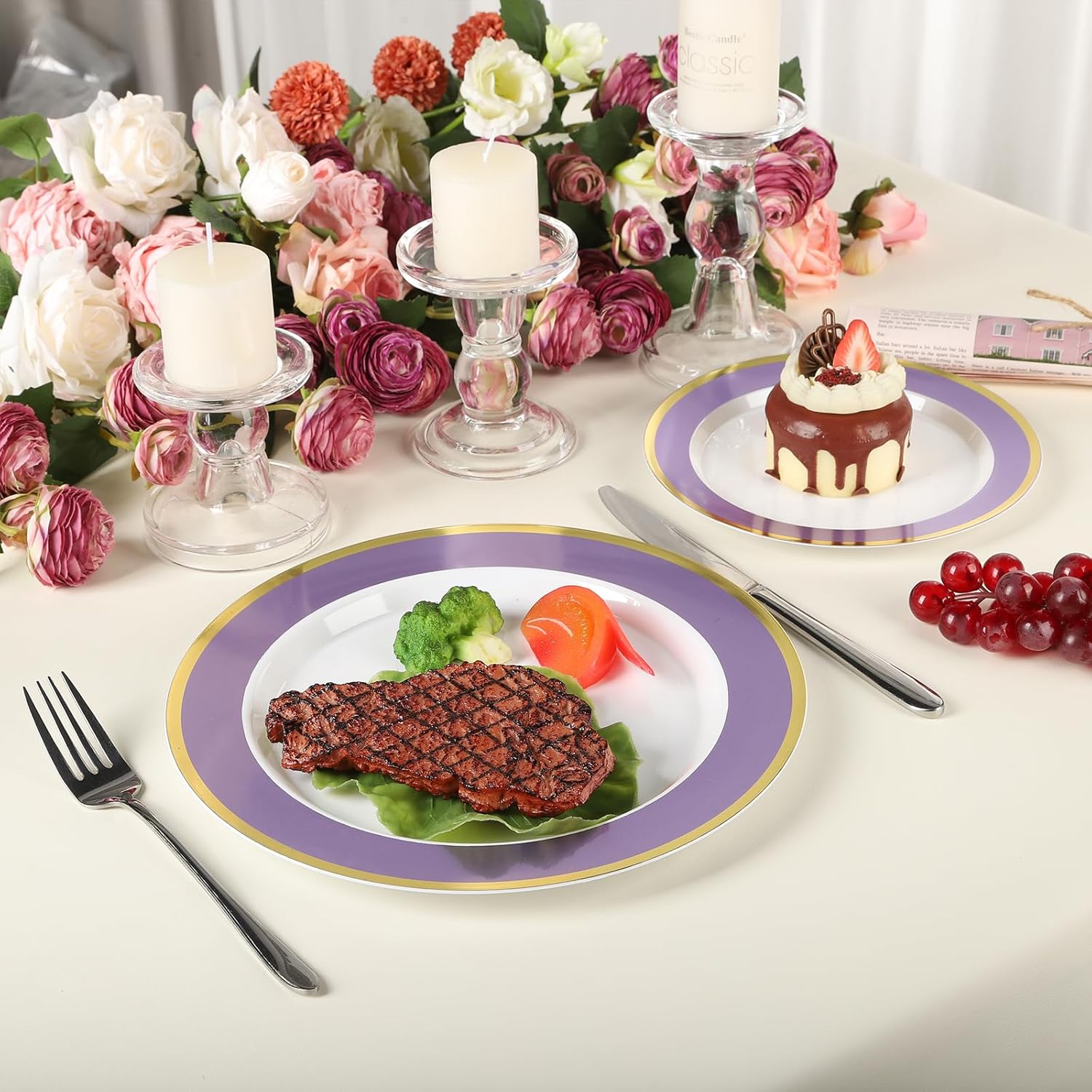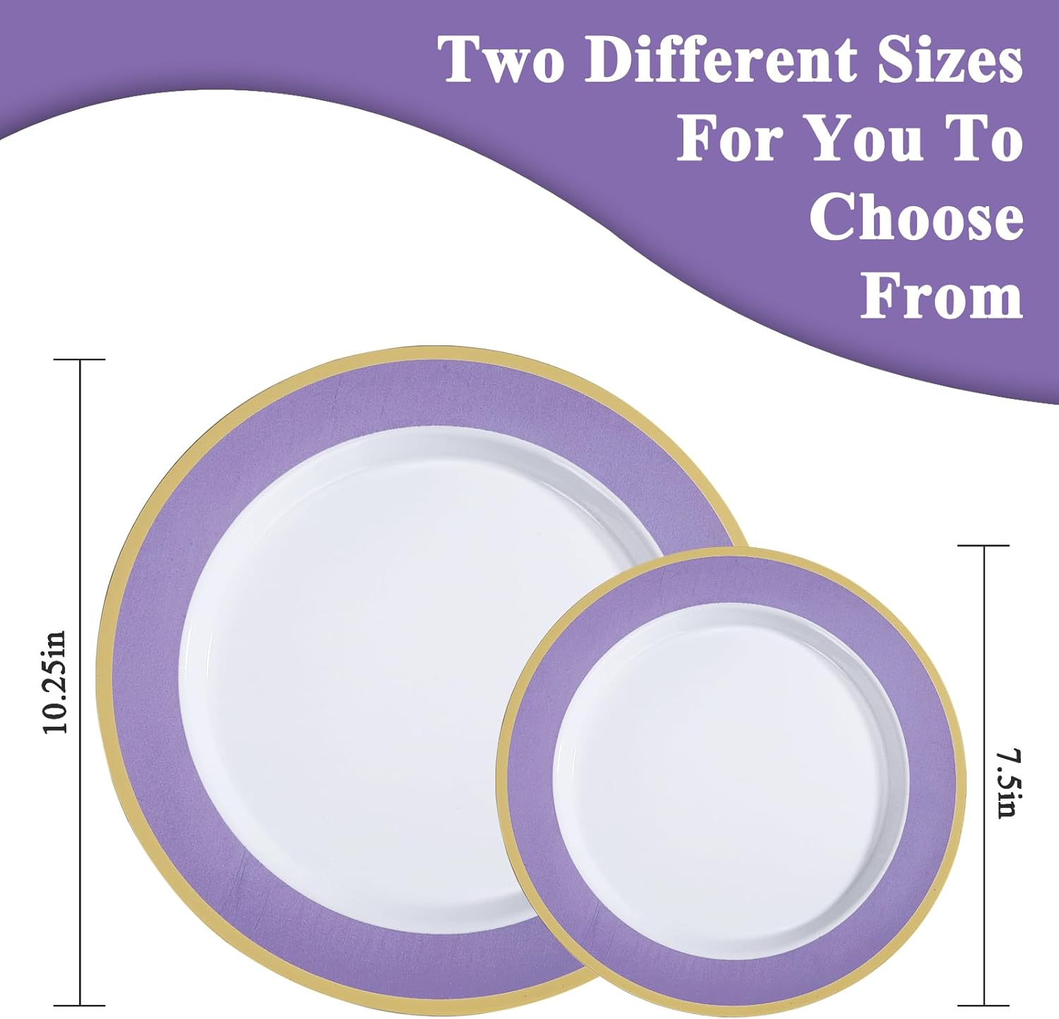 100PCS Purple Disposable Plastic Plates Include 50PCS 10.25inch Dinner Plate and 50PCS 7.5inch Dessert Plate Heavy Duty Plastic Dinnerware for Party Wedding Anniversary New Year