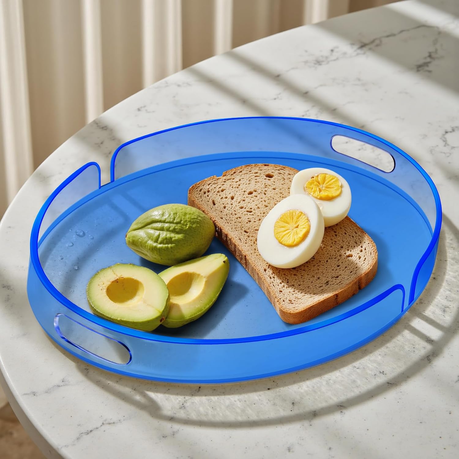 Acrylic Serving Tray with Handles Large Decorative Ottoman Tray 17x13'' Round for Bathroom Food Coffee Fruit Snack Tea Dinner Living Room, Blue
