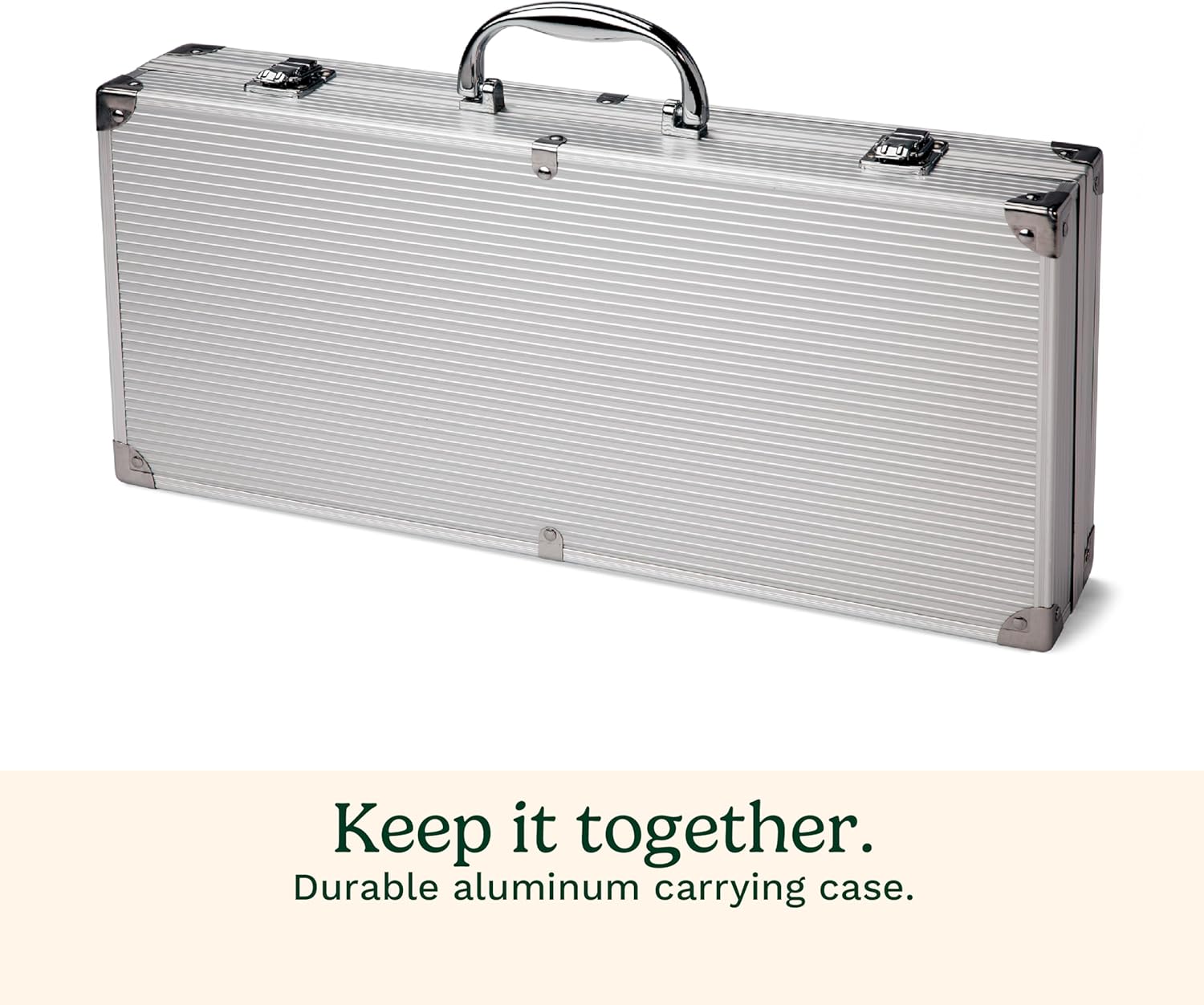 • ALUMINUM CARRYING CASE: Our sturdy, stylish and compact aluminum carrying case perfect for easy transport and organized storage of all your grilling essentials.