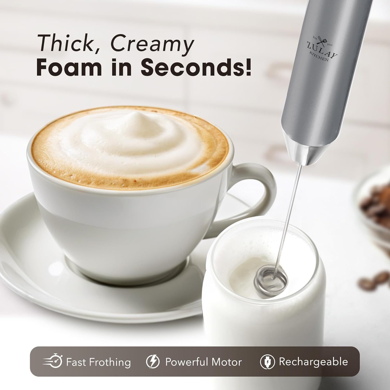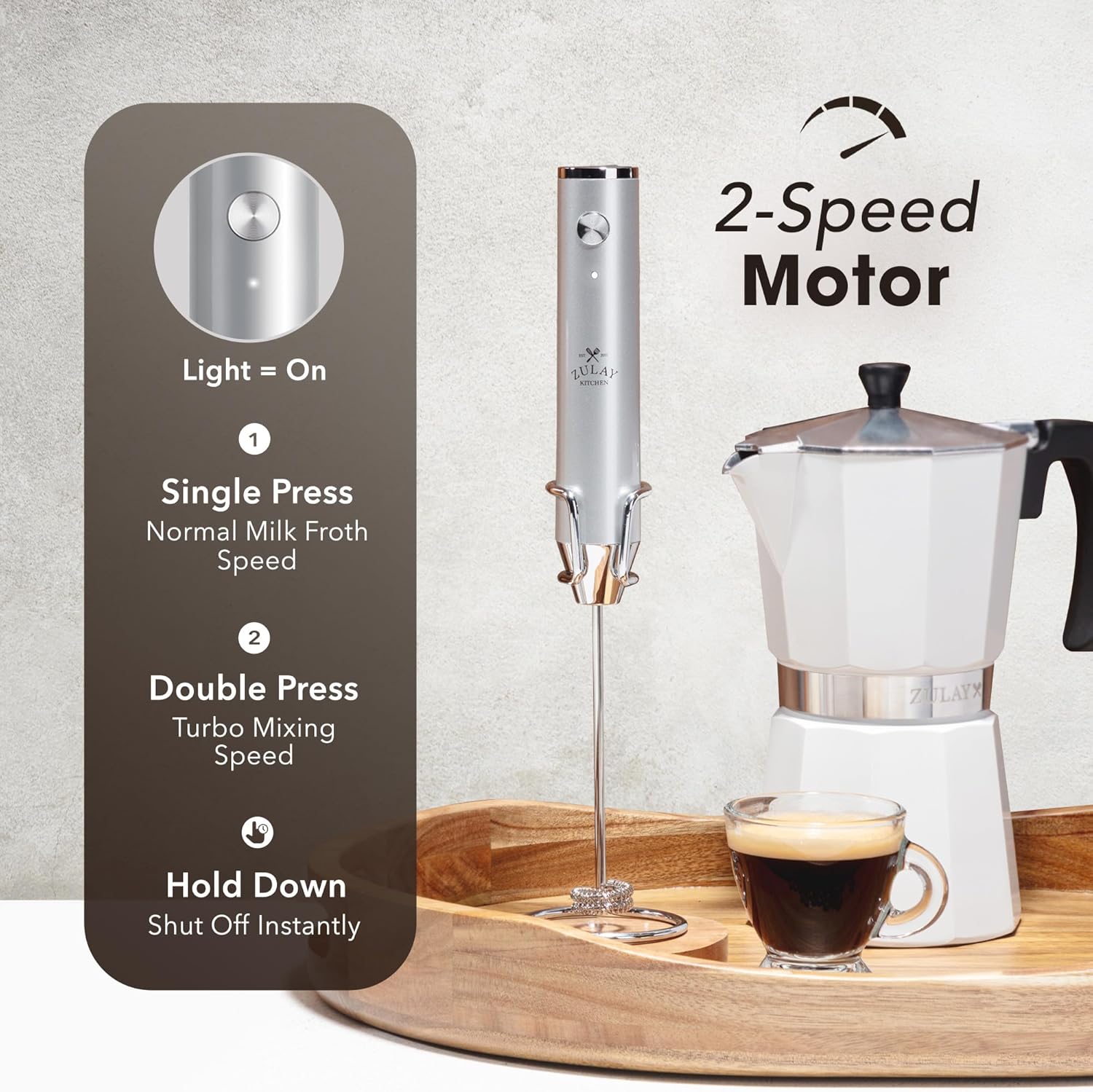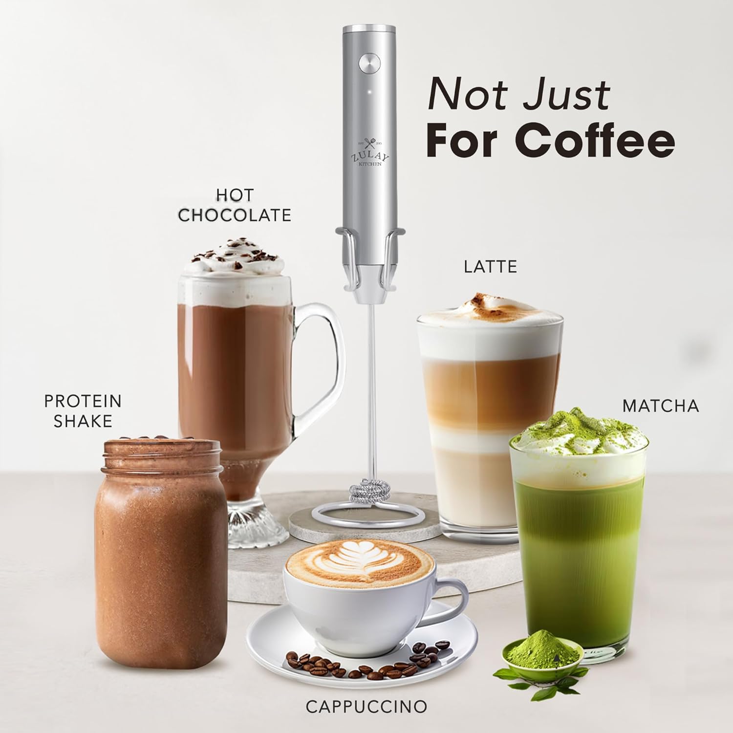 Zulay Kitchen Lux Rechargeable Milk Frother Handheld, 4 Included Whisks - Powerful 2-Speed Motor, Fully Waterproof, 2000mAh Battery - Drink Mixer For Latte, Cappuccino, Matcha, Protein Powder