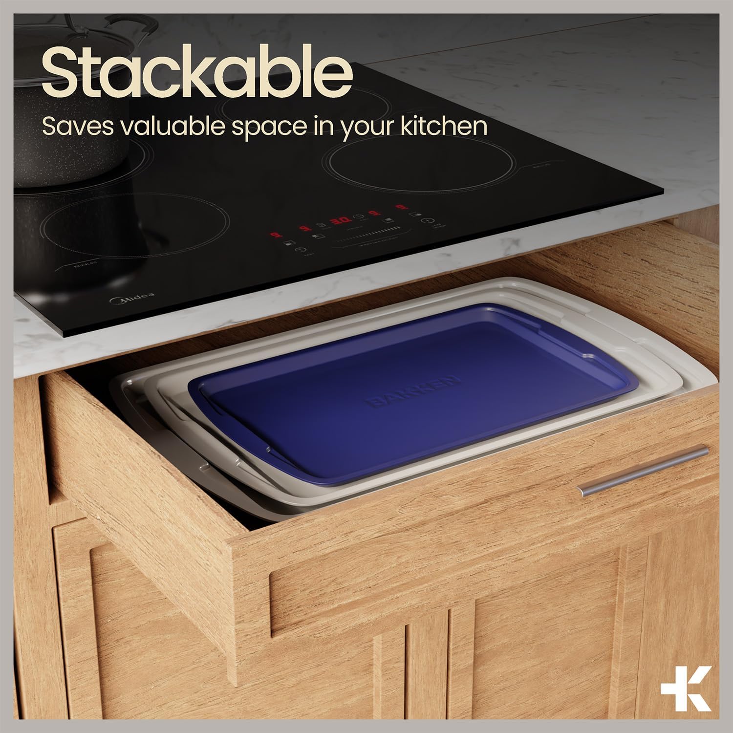 • STACKABLE DESIGN – Keep your kitchen neat and organized! These stackable bakeware set nest together for compact storage, so you can maximize cabinet space without losing track of your bakeware.