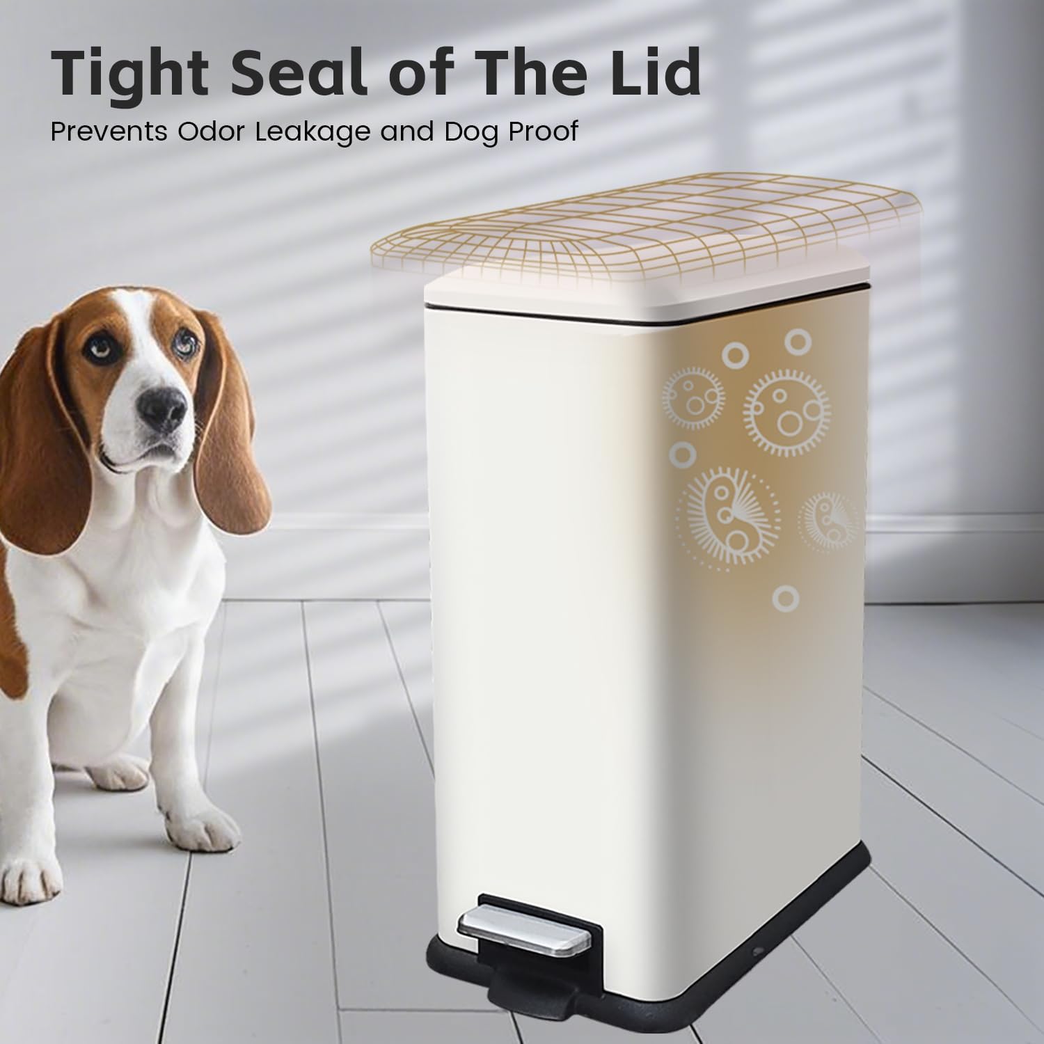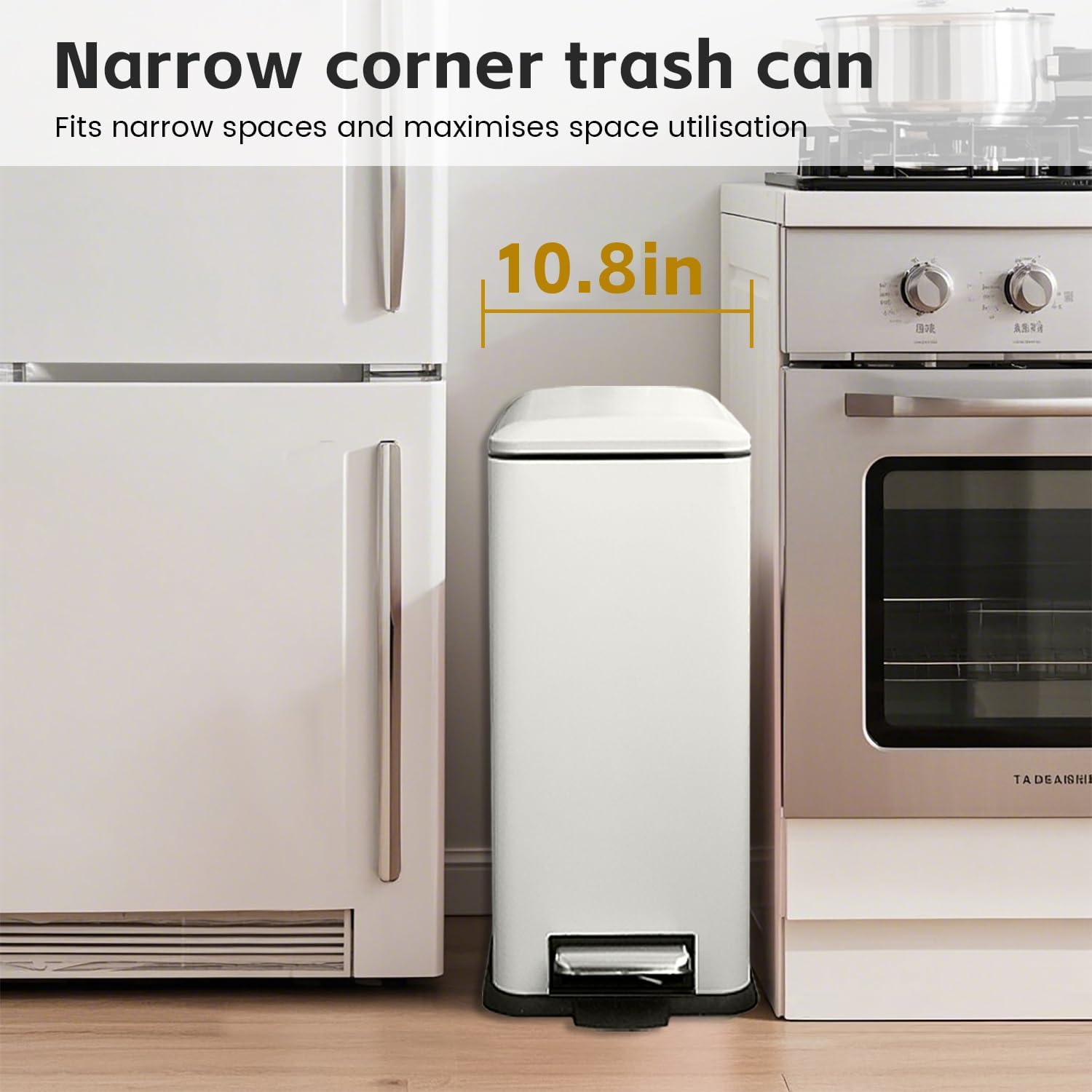 • Stainless Steel Trash Can: Our slim kitchen trash can with lid is made of Stainless Steel, thick and durable, and anti-fingerprint&Rust, and makes cleaning a breeze! A white finish with a sleek modern look that easily matches any decor.