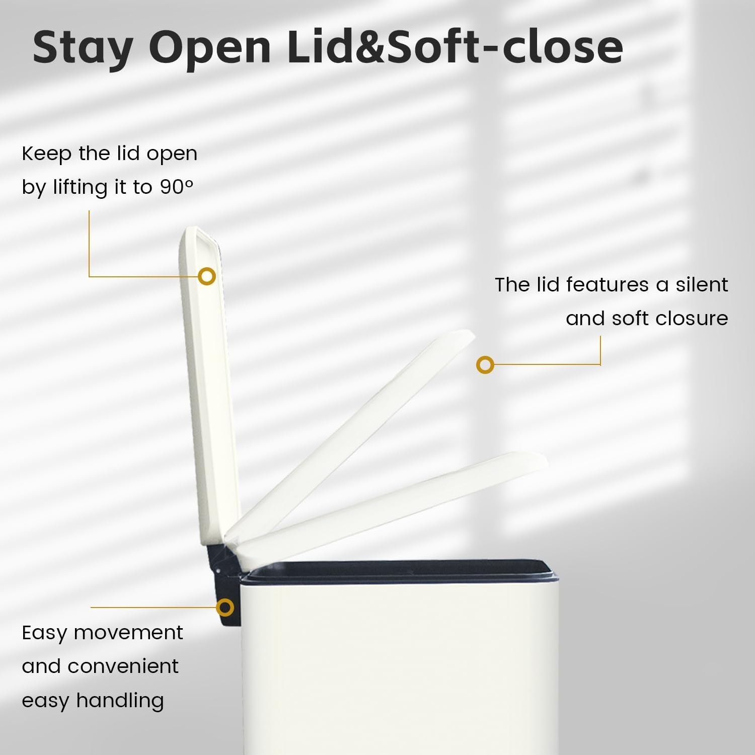 • Soft-Close & Stay-Open Lid: The kitchen trash can 12 gallon with lid closes quietly to prevent slamming and can be held open for hands-free use, making it ideal for busy kitchens and high-traffic areas.