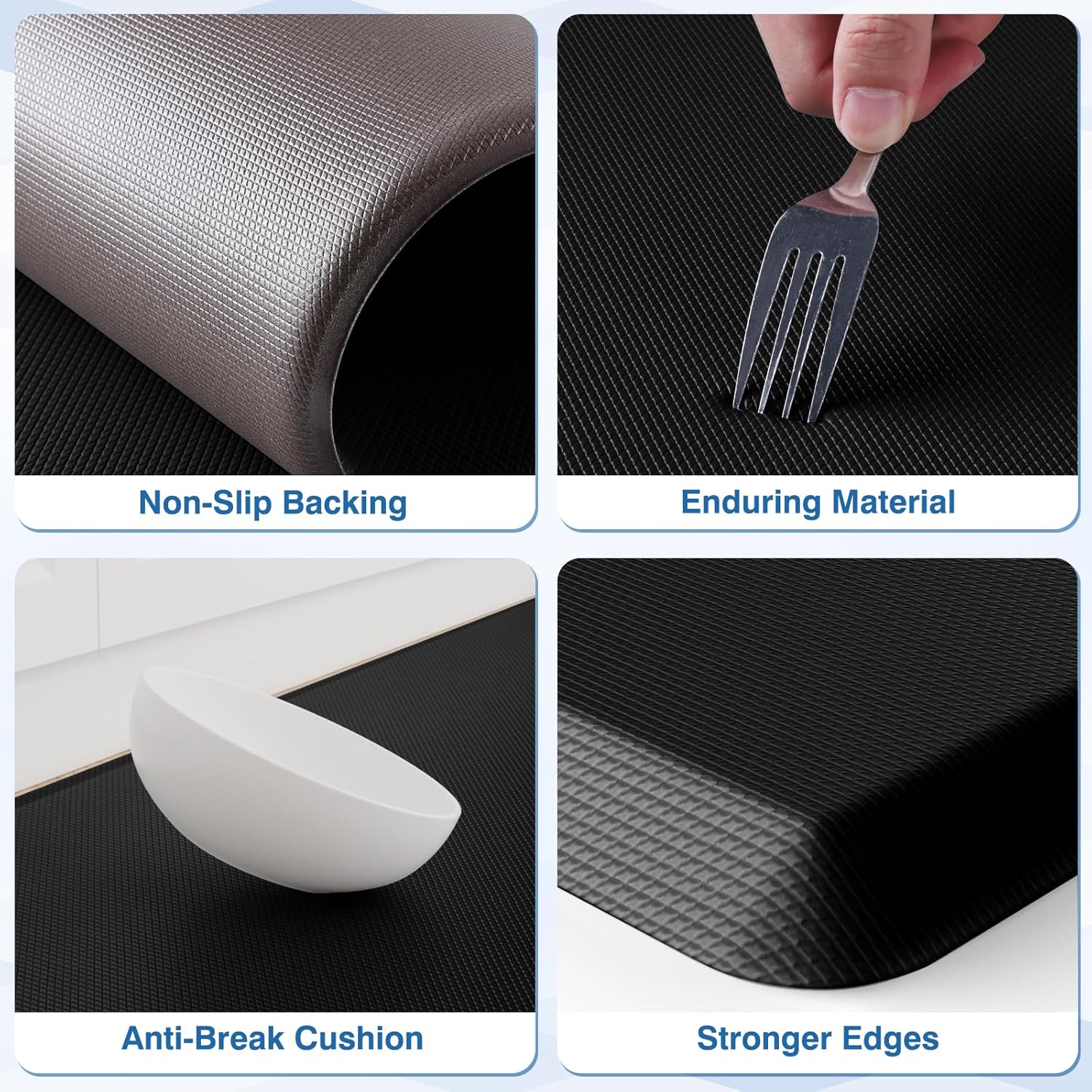 • Non-Slip Design: This standing mat features non-slip backing to keep it securely in place on various surfaces like tile, wood, ceramic, and marble. For optimal safety, always place the kitchen mat on dry, flat surfaces