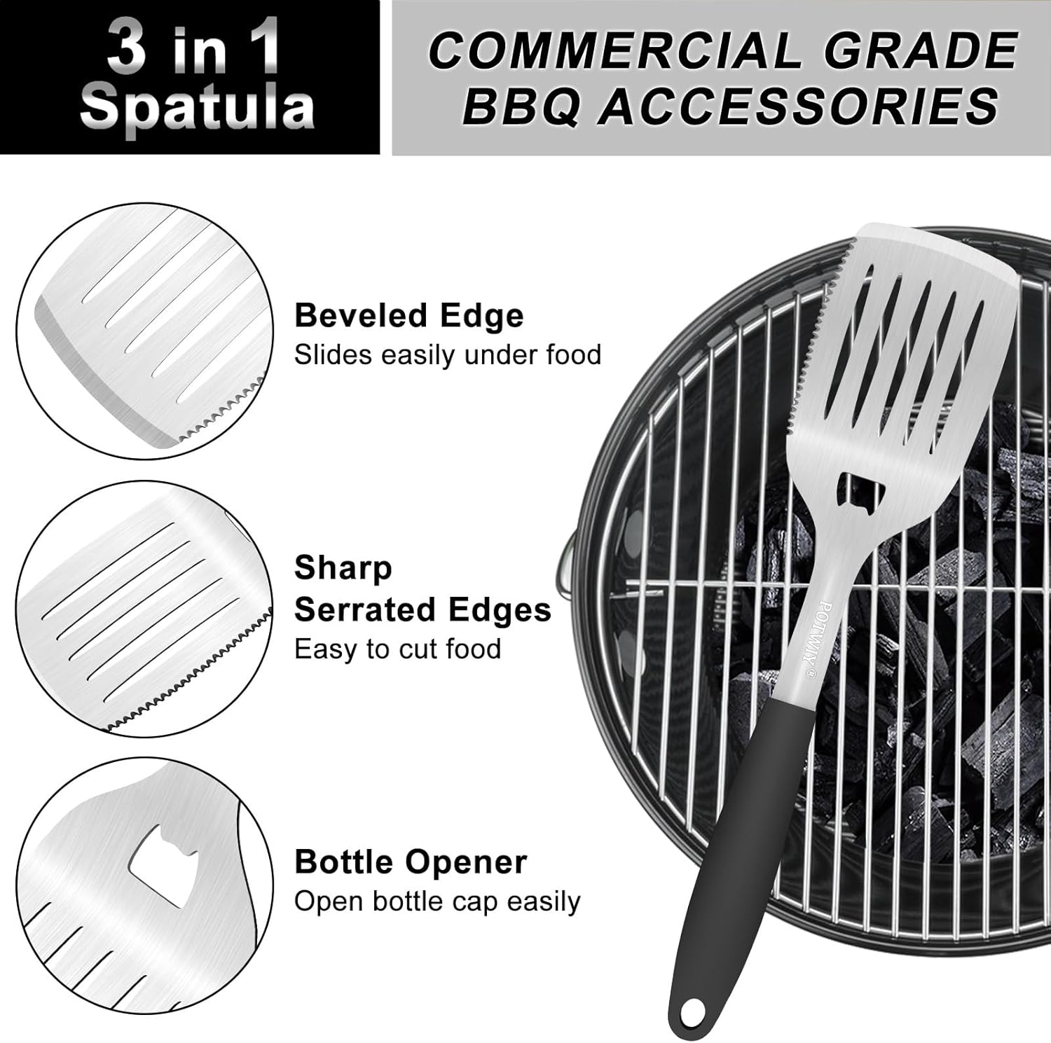 • Multifunctional Grill Utensils Set: The grill tool set with a 3-in-1 grill spatula with serrations and built-in bottle opener, a lockable grill tongs, and a reinforced fork, allowing you to easily flip steaks, flip burgers, and handle delicate vegetables on the grill