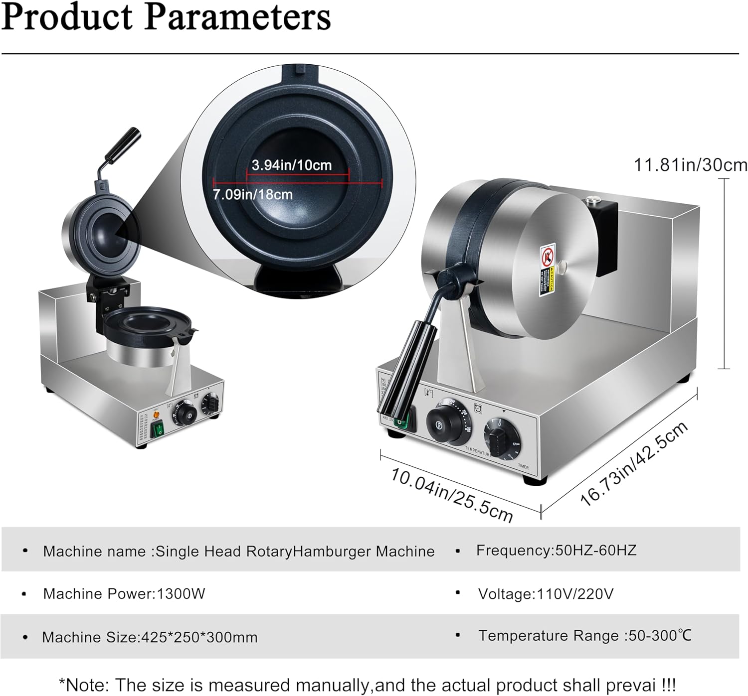 • Widely used: This burger maker is perfect for appearing in burger shops, ice cream shops, snack stands, dessert shops, cake shops, or at family parties or gatherings with friends and family.Soft inside and crispy outside with special flavor, endless aftertaste and alluring smell. Chocolate, floss,ice cream,cream,candies and other decorations can be added freely to add flavor to warm waffles.