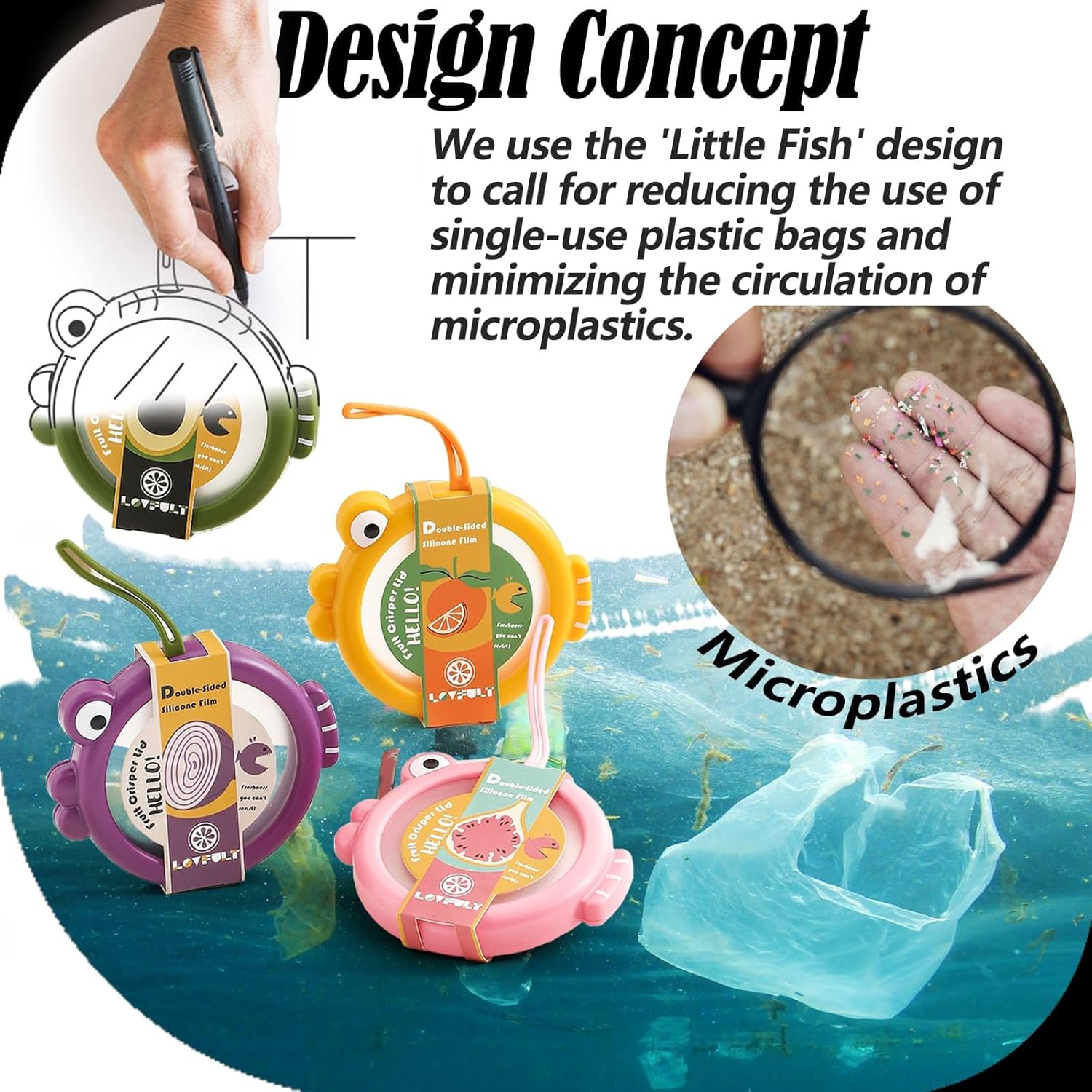 • Design Concept: Our sided silicone lids feature a fish shape, raising awareness of the microplastic issue in oceans. By reducing plastic bag usage, each lid helps prevent over 100 single-use bags from entering the ocean