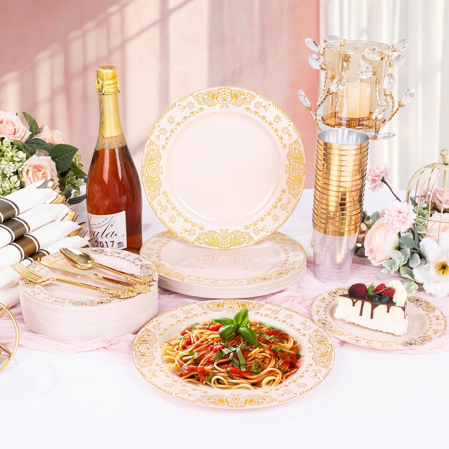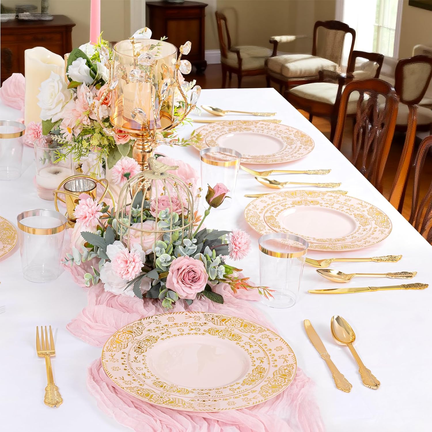 GATHER 350PCS Pink and Gold Plastic Plates - Gold Disposable Dinnerware Set Include 50 Dinner Plates, 50 Dessert Plates, 150 Plastic Silverware, 50 Napkins, 50 Cups for Party & Wedding