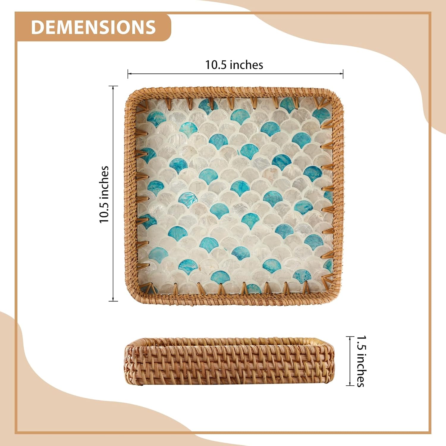 Rattan Tray with Mother of Pearl Inlay, Boho Coffee Table Decor, Decorative Serving Tray, Farmhouse Gift for Living Room & Bathroom