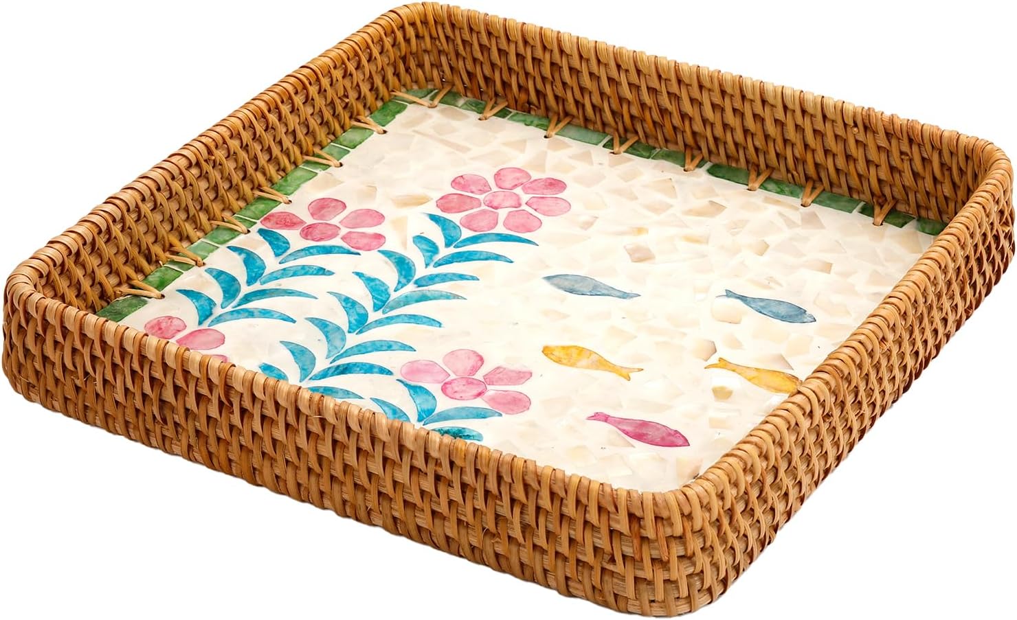 • ใ€๐„๐ฅ๐ž๐ ๐š๐ง๐ญ ๐๐จ๐ก๐จ ๐ƒ๐ž๐œ๐จ๐ซใ€‘Handcrafted rattan tray with unique Mother of Pearl inlay, adding elegance and a natural boho touch to any home.