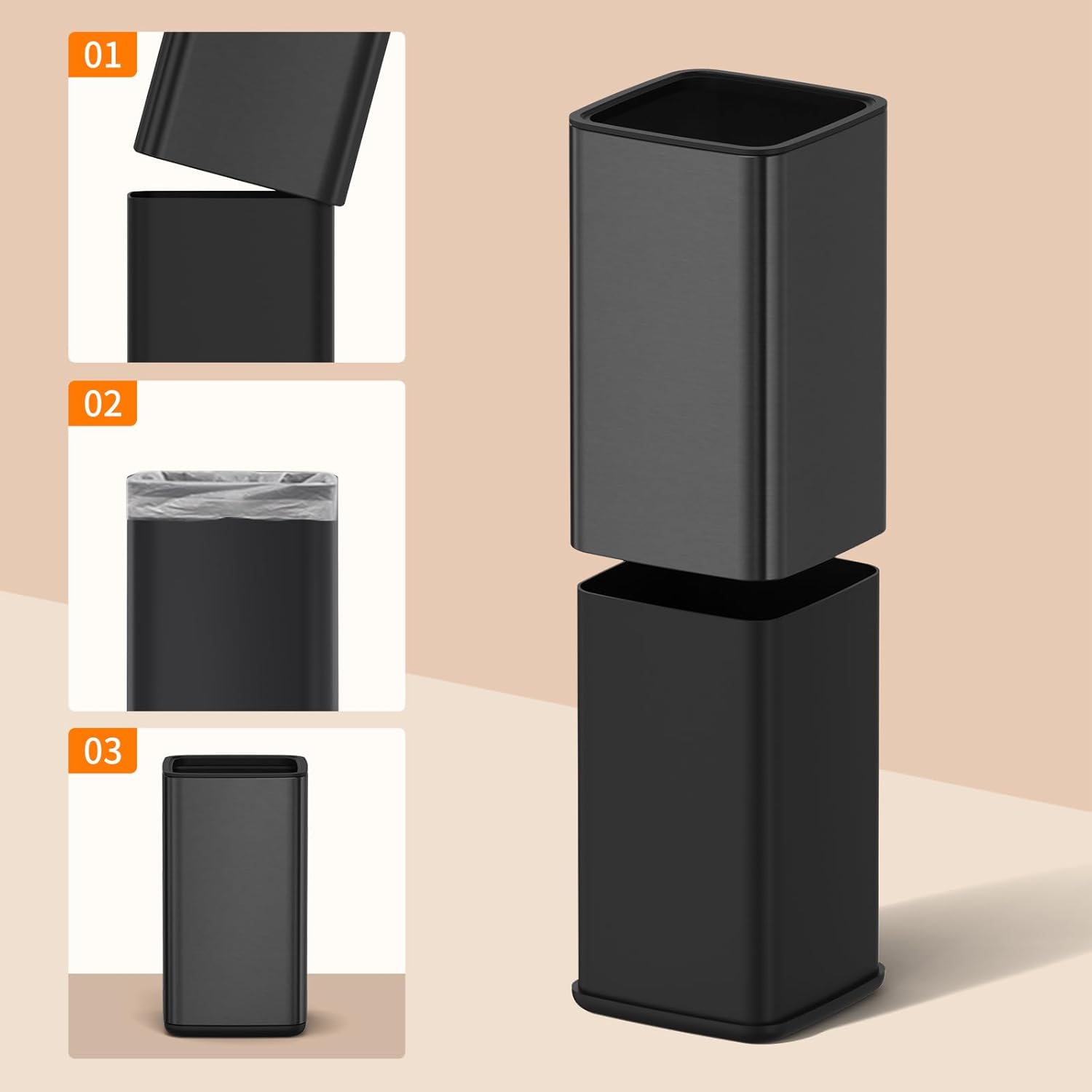 • Efficient 9L (2.4 Gallon) capacity WASTE BASKET, perfect for small OFFICE spaces or BATHROOM use, ensuring a clutter-free environment.