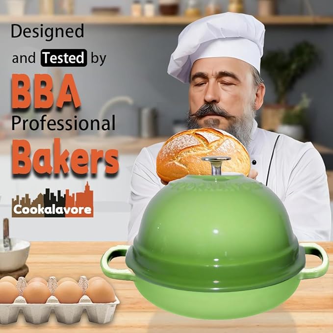• 🍞GAME-CHANGING INNOVATION:Elevate your baking game with the Cookalavore bread oven!Its innovative dome design ensures optimal steam circulation,guaranteeing that sourdough rises perfectly and develops a mouthwatering golden crust with each bake.13.8" diameter with handles,10.6" without handles,7.6" high with the knob,6 QT Bread oven equipped with Silicone Baking Liner(21"x8.7"),recipes help easily master baking steps,takes your baking game next level.Say hello to effortless baking perfection!