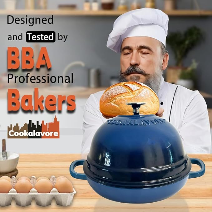 • 🍞GAME-CHANGING INNOVATION:Elevate your baking game with the Cookalavore bread oven!Its innovative dome design ensures optimal steam circulation,guaranteeing that sourdough rises perfectly and develops a mouthwatering golden crust with each bake.13.8" diameter with handles,10.6" without handles,7.6" high with the knob,6 QT Bread oven equipped with Silicone Baking Liner(21"x8.7"),recipes help easily master baking steps,takes your baking game next level.Say hello to effortless baking perfection!