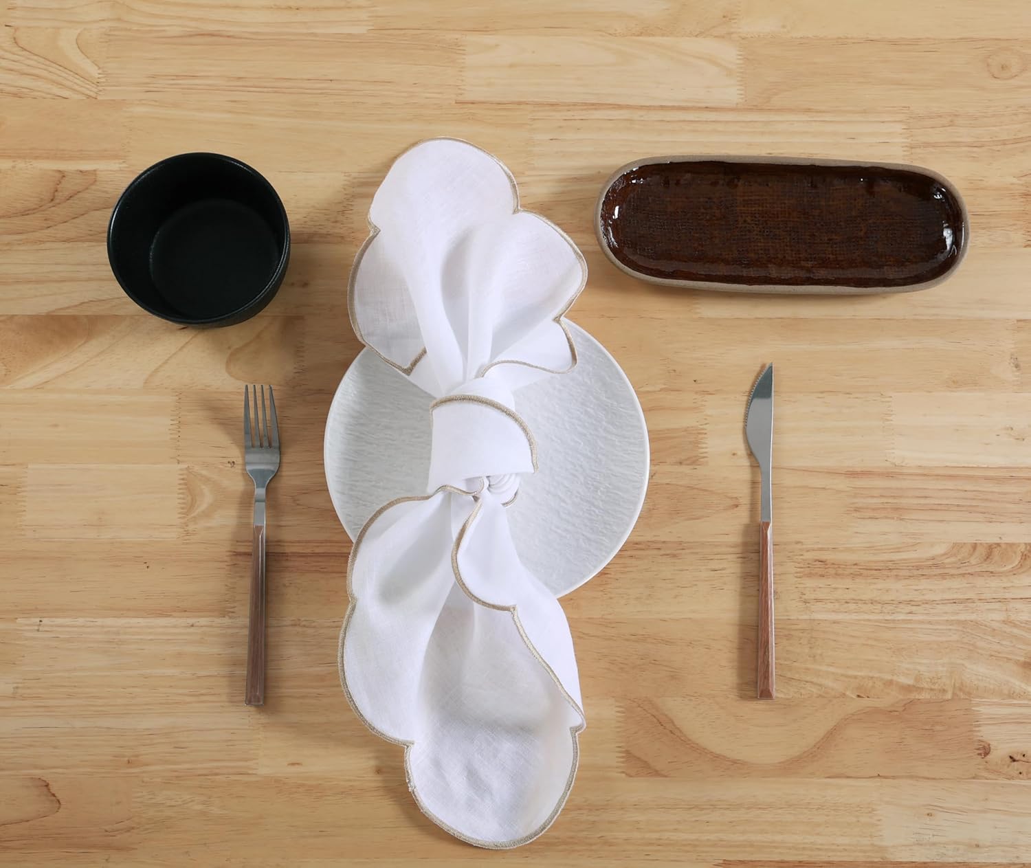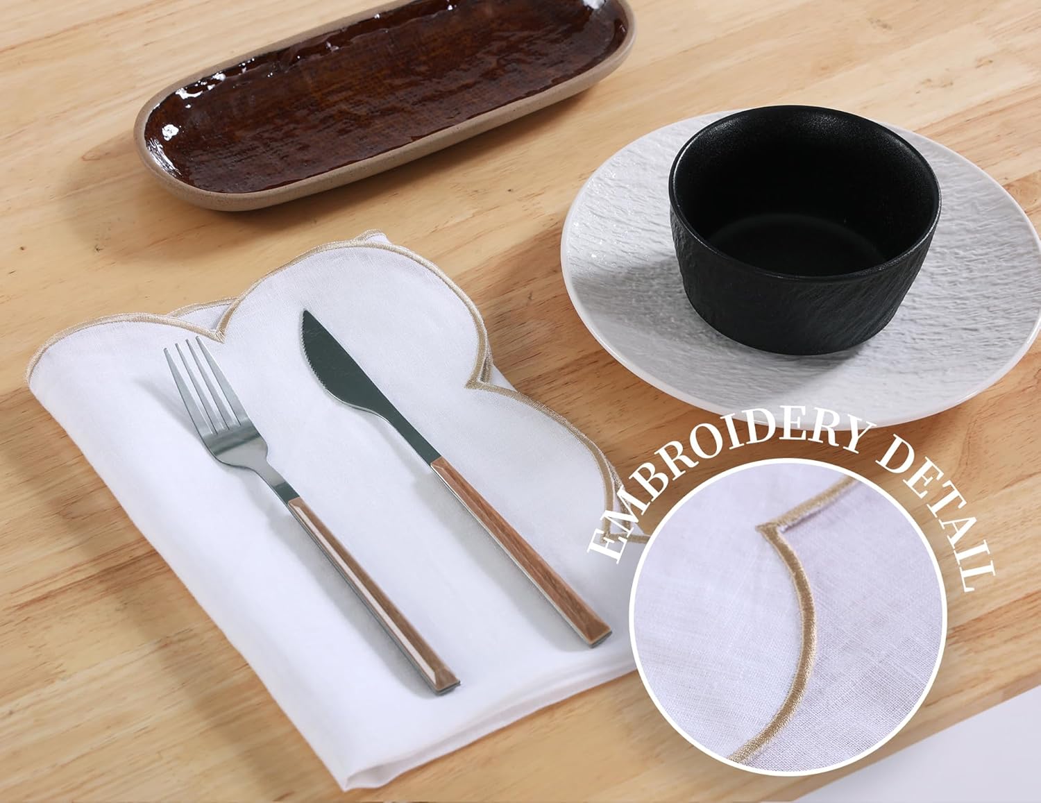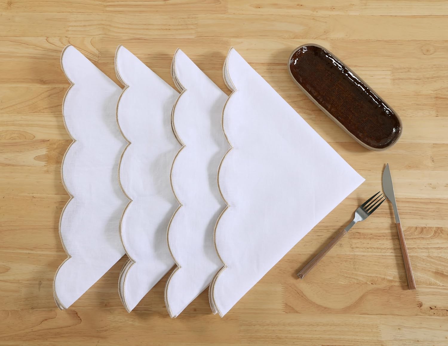 100% French Flax Linen Cloth Napkins Scalloped Embroidery 20’’x20’’ for Dinners, Parties, Weddings, Decorative Halloween, Spring, Easter, Set of 4 Pcs,White(Edges-Gold)