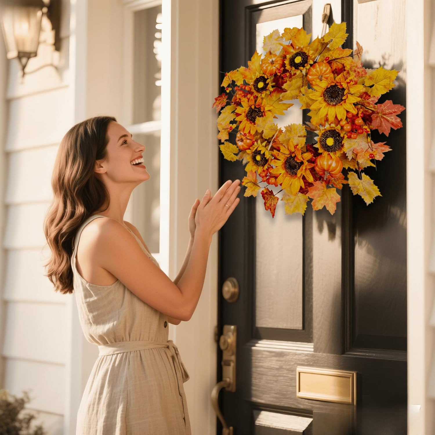• Vibrant Autumn Welcome: Instantly brighten your entryway with this stunning Zhemobang 22 Inch Fall Wreath with Sunflowers! It's the perfect Fall Wreath for Front Door, bursting with cheerful sunflowers, rustic pumpkins, and rich autumn hues to greet your guests with warmth