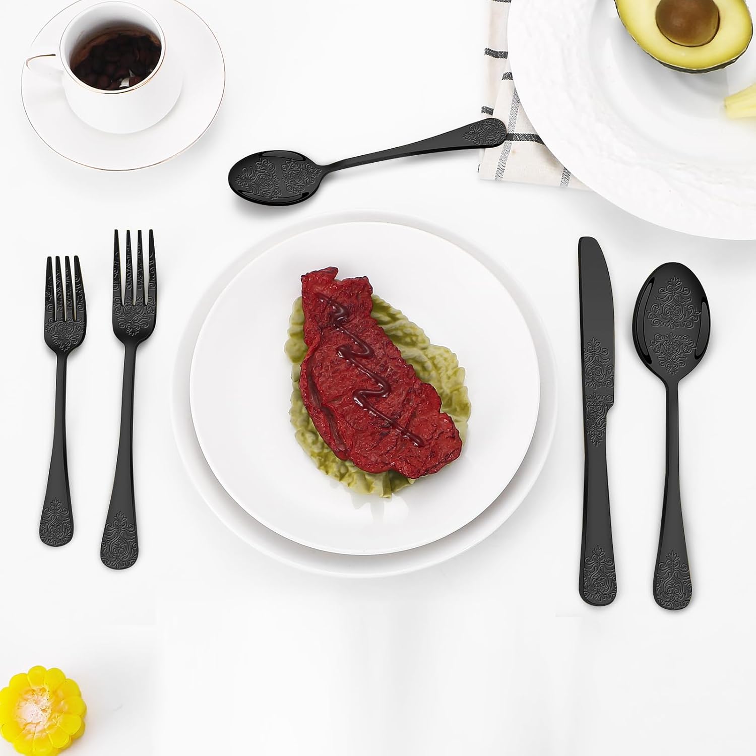 • WONDERFUL WORKMANSHIP AND FUNCTIONAL---Our black utensils set is made of multiple mirror polishing treatment,black silverware set with floral design Each piece is beautifully adorned with a delicate floral pattern,edge smooth , elegant and classical appearance, adding to the beautiful experience of everyday dining.