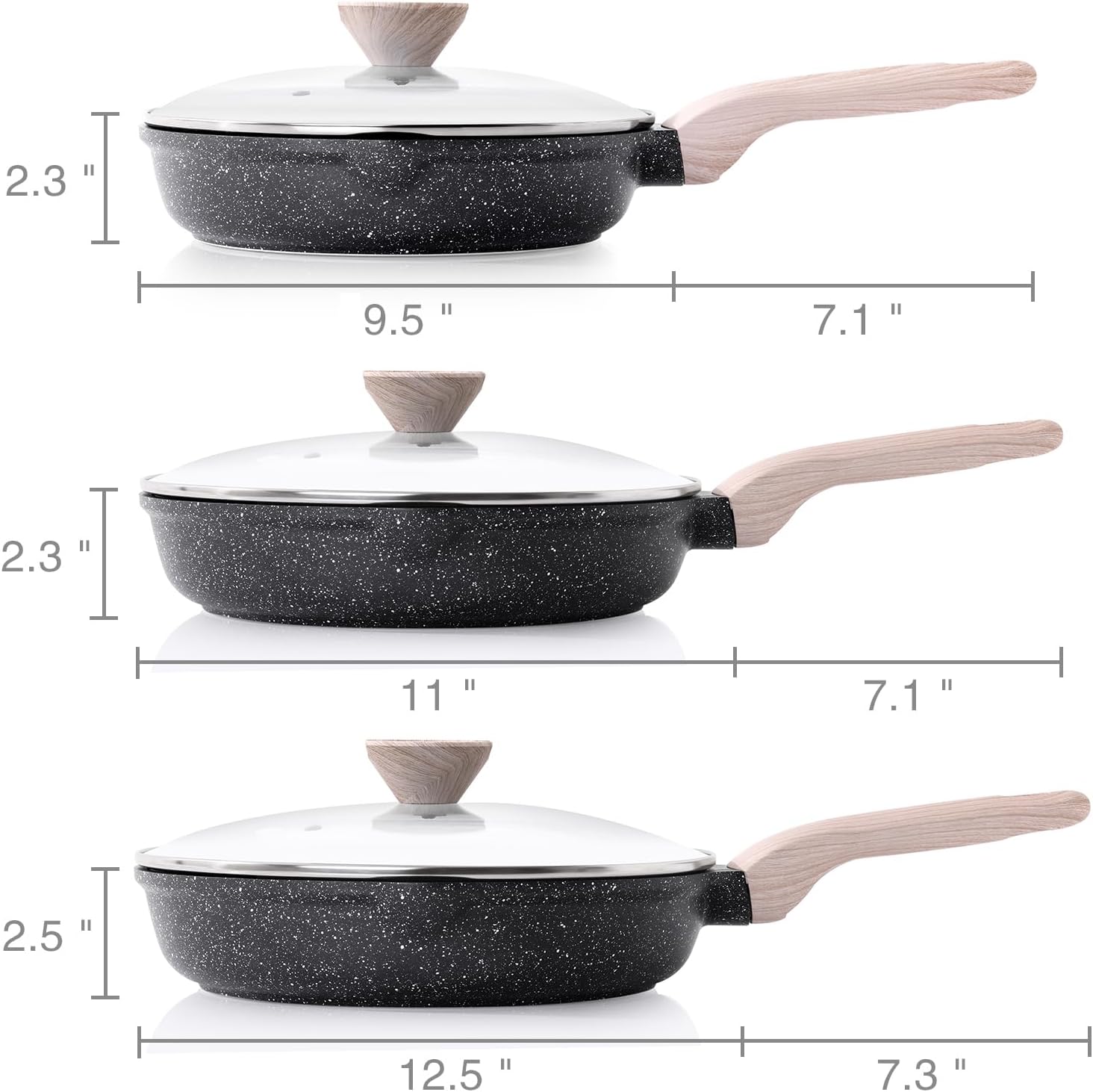 Kordisen Nonstick Frying Pan Set with Lids, 3 Piece Skillet Set, Healthy Induction Cookware Cooking Pan, Stay-Cool Handle, Compatible with All Stovetops, PFOA Free (9.5, 11, 12.5 Inch)