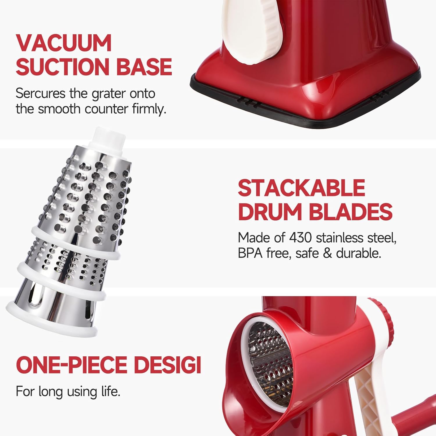 • 【Thoughtful Design】The drum-style rotary grater features strong suction feet to stay stable on your countertop. Its hand crank is efficient and easy to use, while detachable parts make disassembly a snap—saving storage space and keeping your kitchen organized.