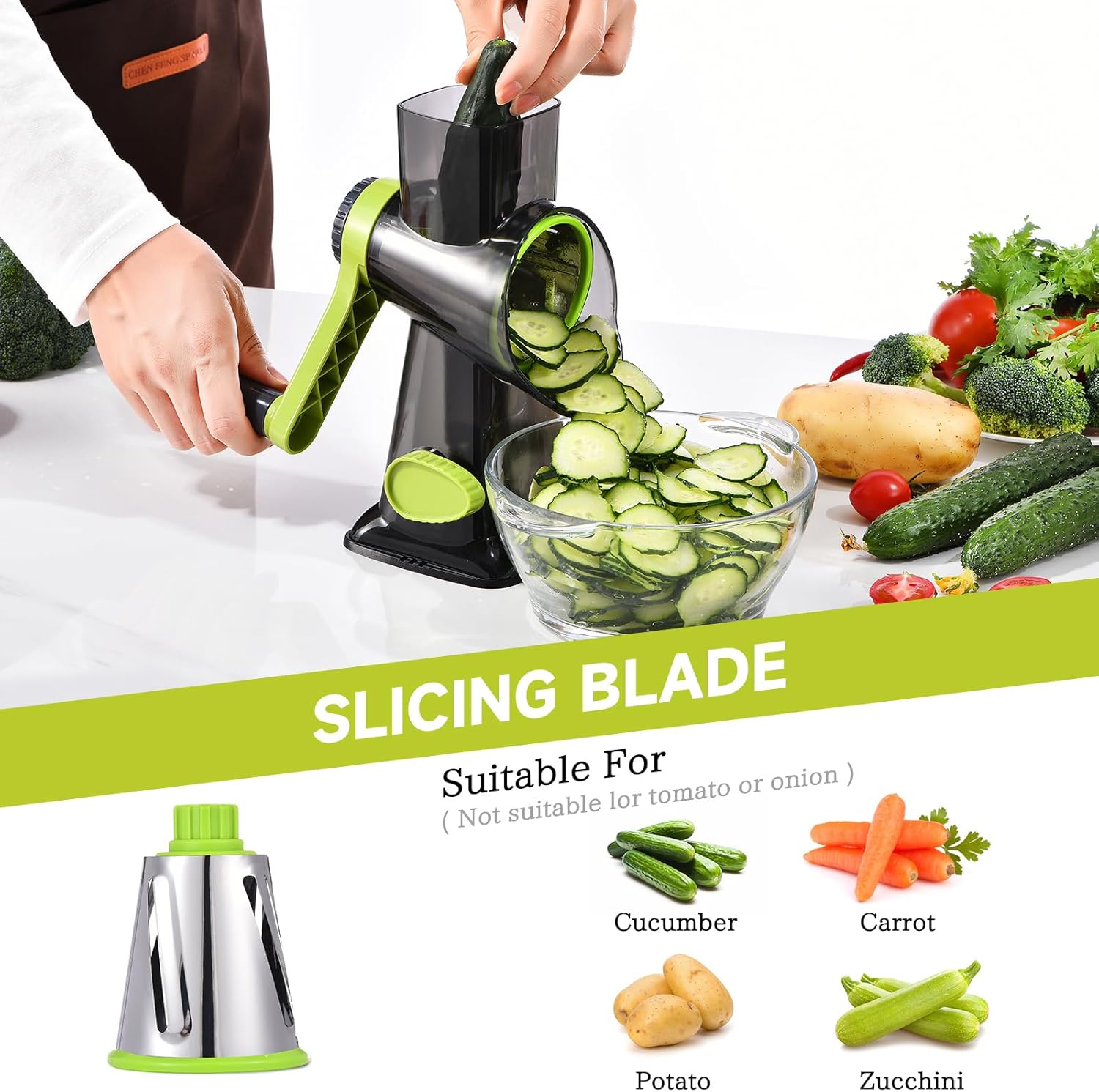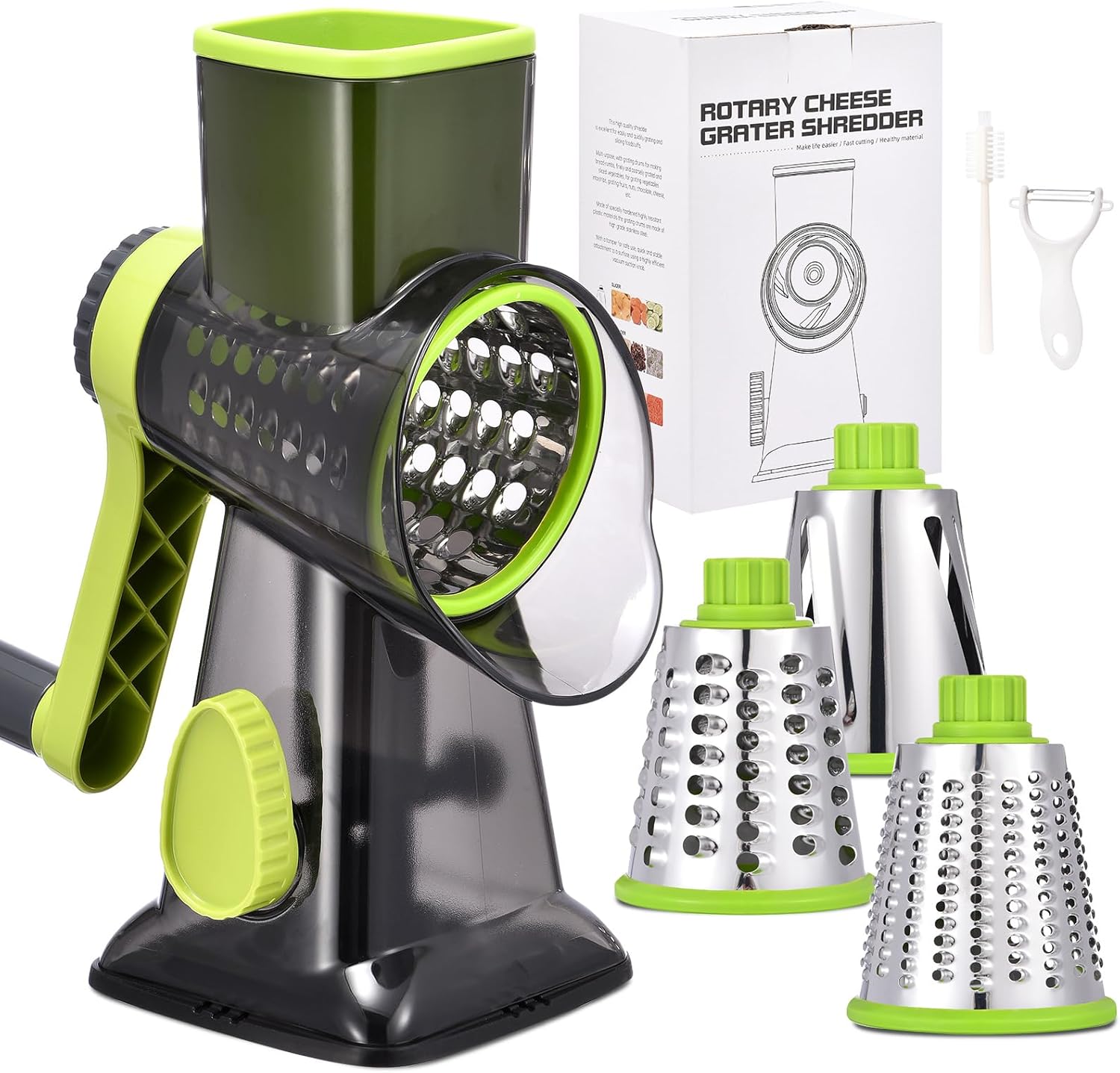 Rotary Cheese Grater with Handle Kitchen Shredder Slicer Grater Slicer Ice Shaver Cheese Vegetable Nuts Potato Zucchini Chocolate 3 Interchangeable Blades (Green TSP)
