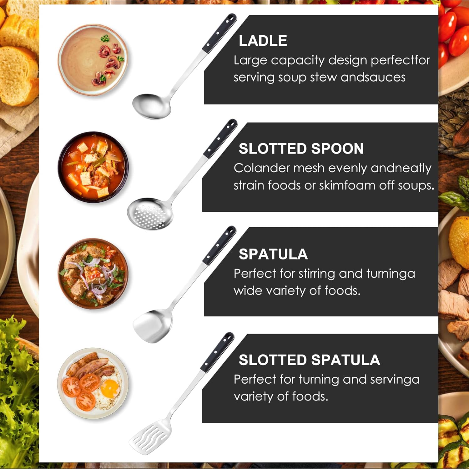 • 【Ergonomic Heat-Resistant Handle】These kitchen utensils feature seamless one-piece stainless steel construction. The handles combine high-quality PP material layered over a stainless steel core, anchored with triple rivets for maximum strength. This design delivers both durability and style, while the PP handle effectively shields your hands from heat during cooking and serving. The wok utensils ergonomic handle for easily holding that more comfortable and secure for you to use